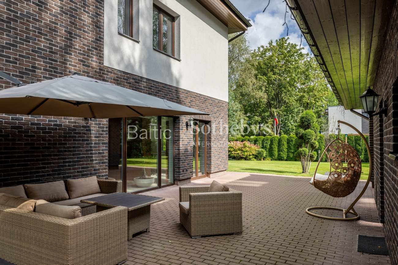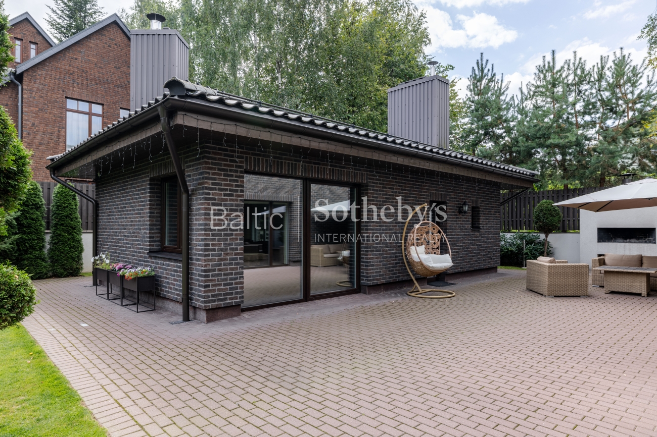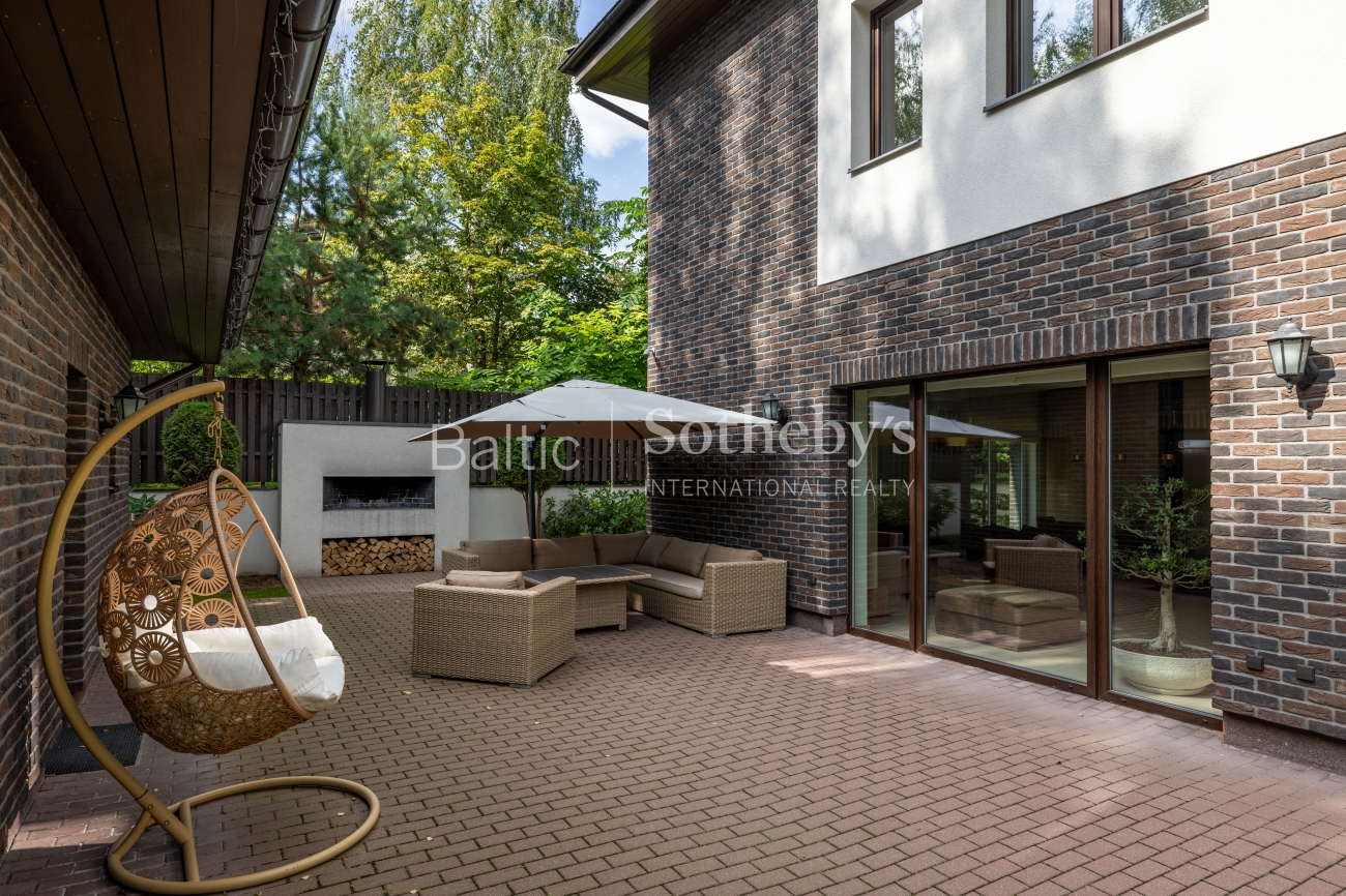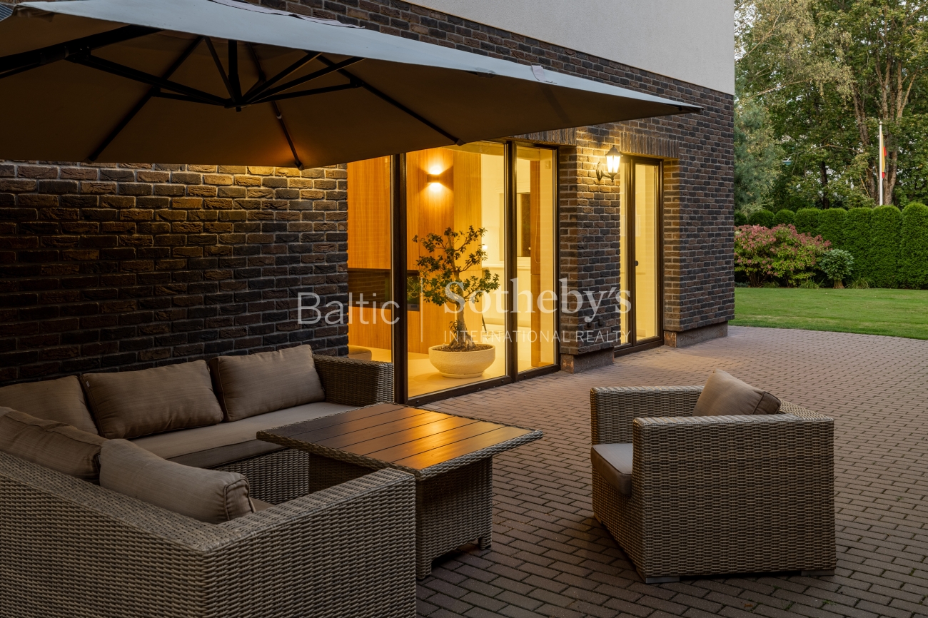 Namas išsiskiria ilgaamžiu klinkeriniu fasadu ir erdviu, landšafto dizainerio kurtu kiemu, kuriame harmoningai įkomponuoti brandūs medžiai. Kieme įrengtos klinkerio trinkelės, jauki terasa bei didelis lauko židinys, veikia automatinė laistymo sistema, sumontuotas apšvietimas ir automatiniai vartai. Pastatytas atskiras 58 kv.m pirties namukas su hidromasažine jacuzzi vonia, iš raudonojo kanadietiško kedro įrengta elektrine pirtimi, dušais, virtuvėle ir jaukiu židiniu.