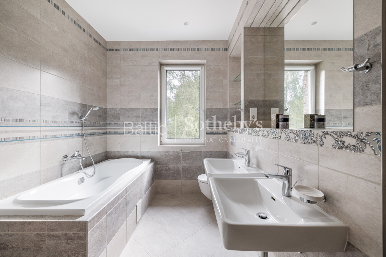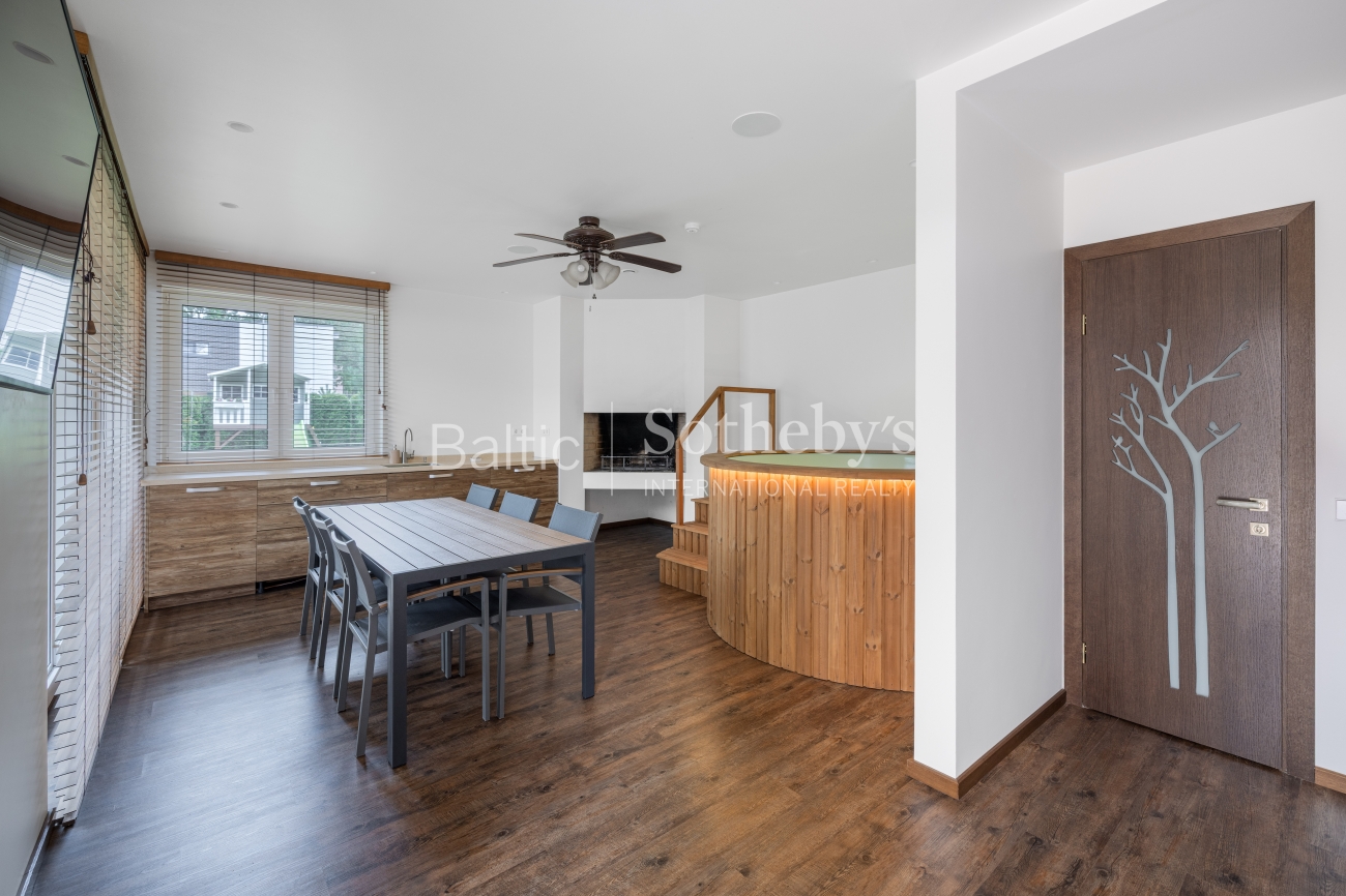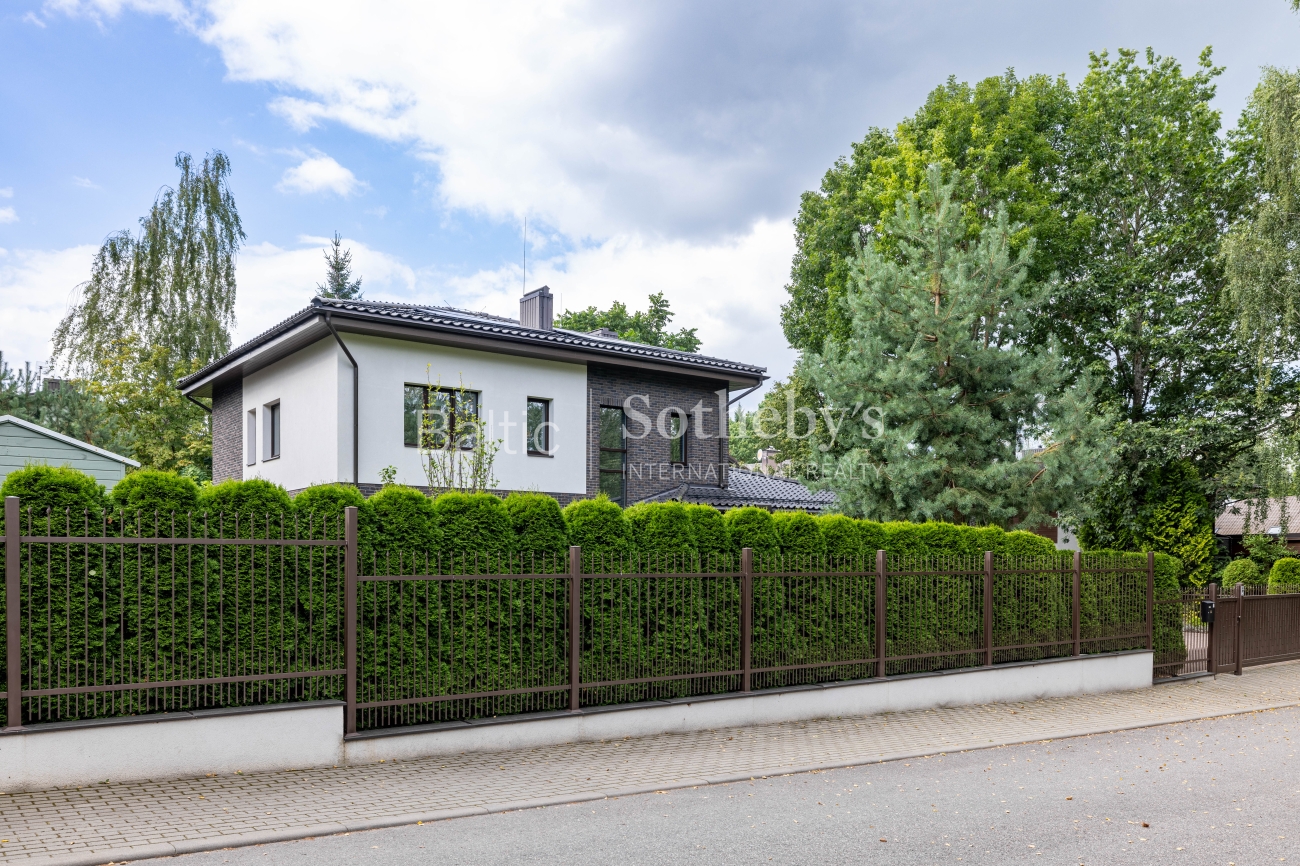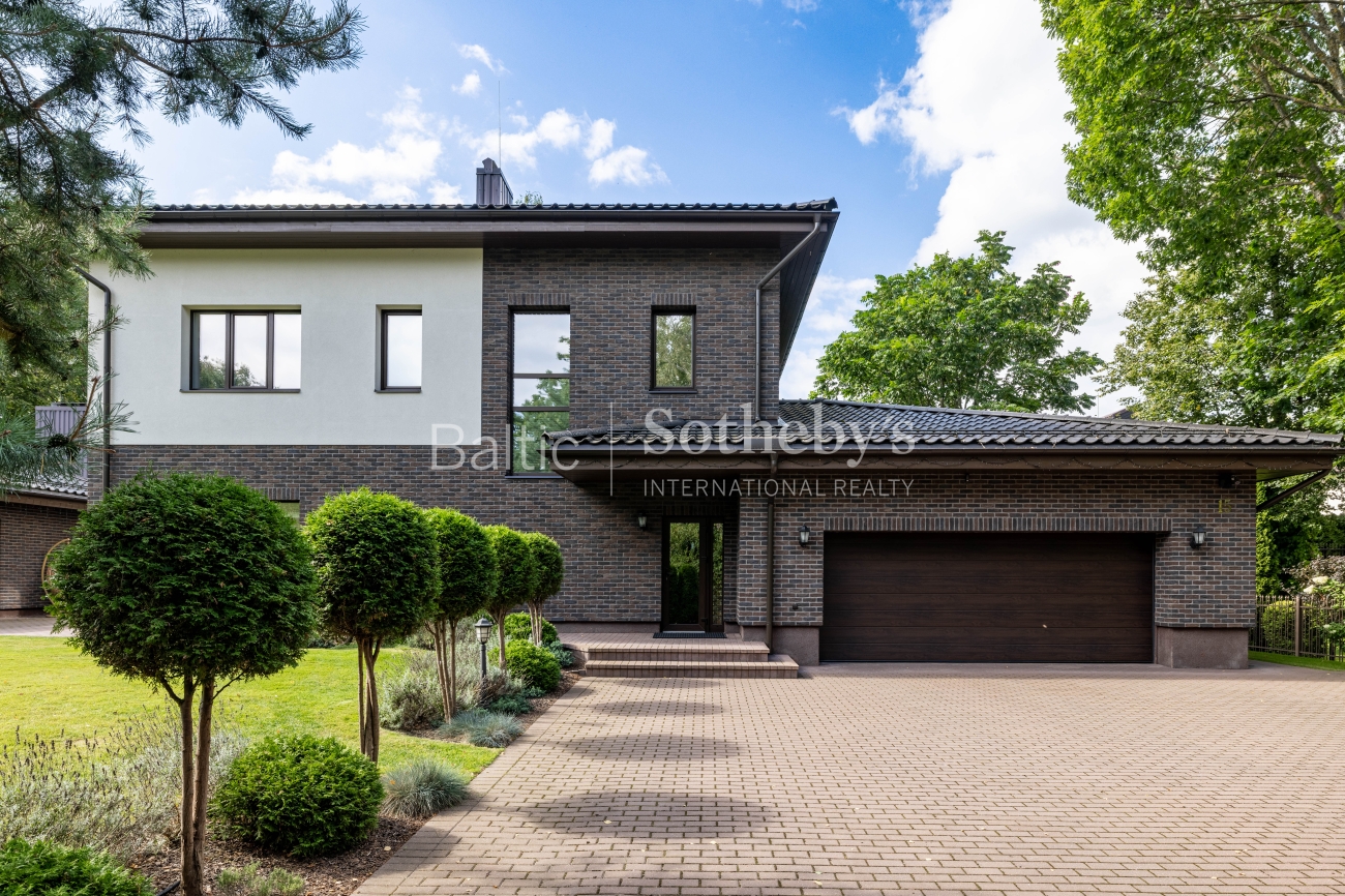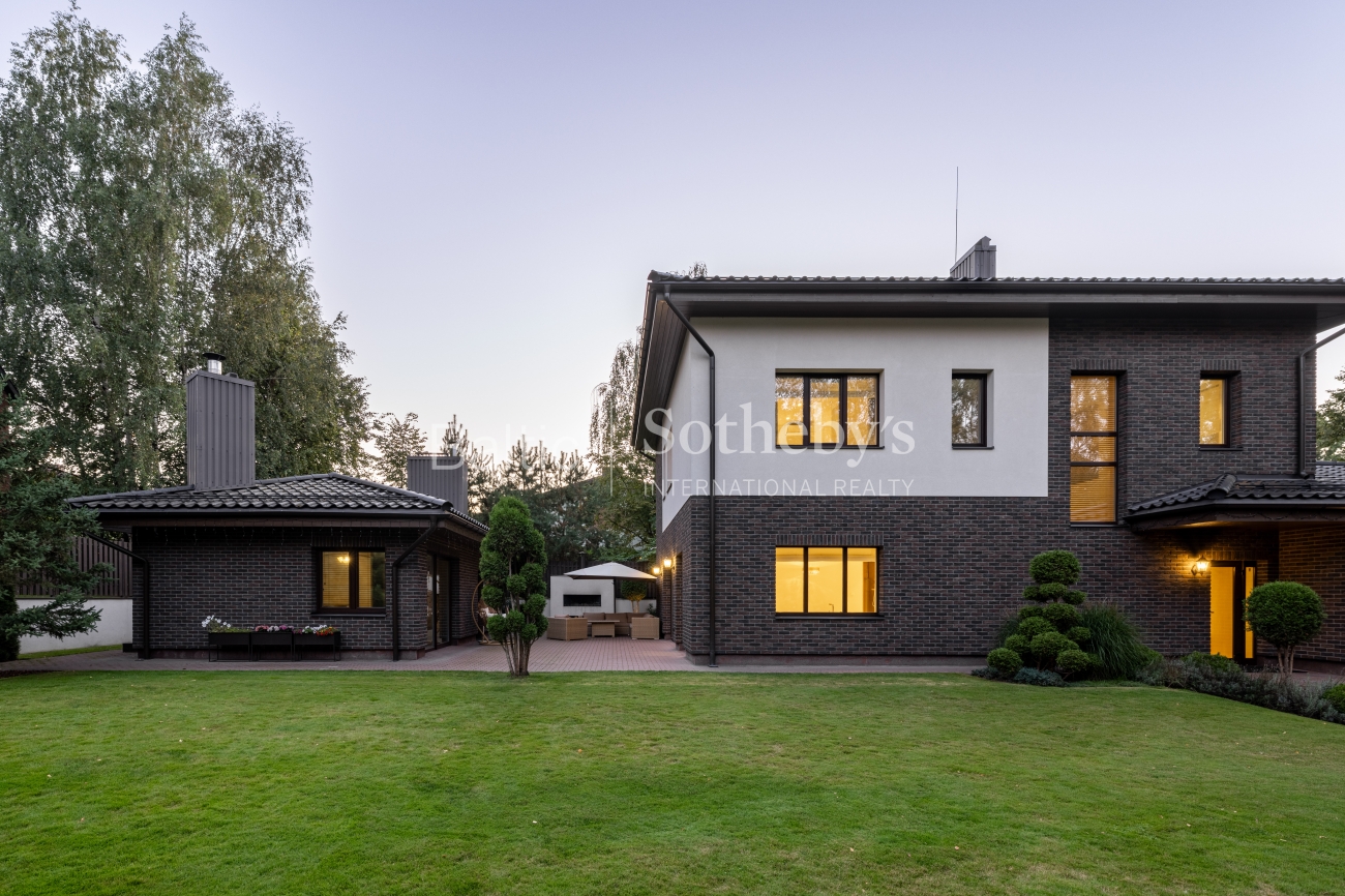 Namas išsiskiria ilgaamžiu klinkeriniu fasadu ir erdviu, landšafto dizainerio kurtu kiemu, kuriame harmoningai įkomponuoti brandūs medžiai. Kieme įrengtos klinkerio trinkelės, jauki terasa bei didelis lauko židinys, veikia automatinė laistymo sistema, sumontuotas apšvietimas ir automatiniai vartai. Pastatytas atskiras 58 kv.m pirties namukas su hidromasažine jacuzzi vonia, iš raudonojo kanadietiško kedro įrengta elektrine pirtimi, dušais, virtuvėle ir jaukiu židiniu.
