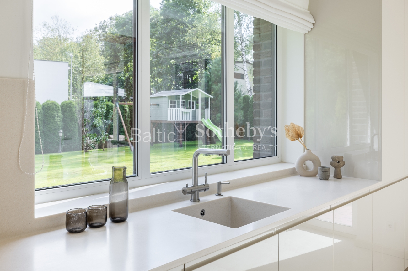 Inžineriniai sprendimai garantuoja ekonomišką ir komfortišką gyvenimą. Šildymui naudojamas geoterminis "NIBE" 15 kW katilas su trimis 100 metro gylio gręžiniais, integruotas 300 litrų boileris su akumuliacine talpa ir grindų vėsinimo funkcija. Įrengta moderni "PAUL NOVUS 450" rekuperacinė sistema su drėgmės grąžinimu bei centriniu drėkintuvu. Klimato kontrolę papildo „Daikin“ kondicionieriai svetainėje ir miegamajame bei papildomi įrenginiai kituose kambariuose. Langai – "REHAU BRILLIANT", penkių kamerų, su selektyviniais stiklais bei papildoma apsauga nuo dūžio ir kondensato. Elektros įvadas siekia 22 kW, įrengta 10 kW saulės elektrinė. Miesto vandentiekis ir kanalizacija papildyti nugeležinimo bei minkštinimo filtrais ir hidroforu, todėl vandens tiekimas užtikrinamas net intensyviai laistant vasarą. Namo saugumui sumontuoti žaibolaidžiai.