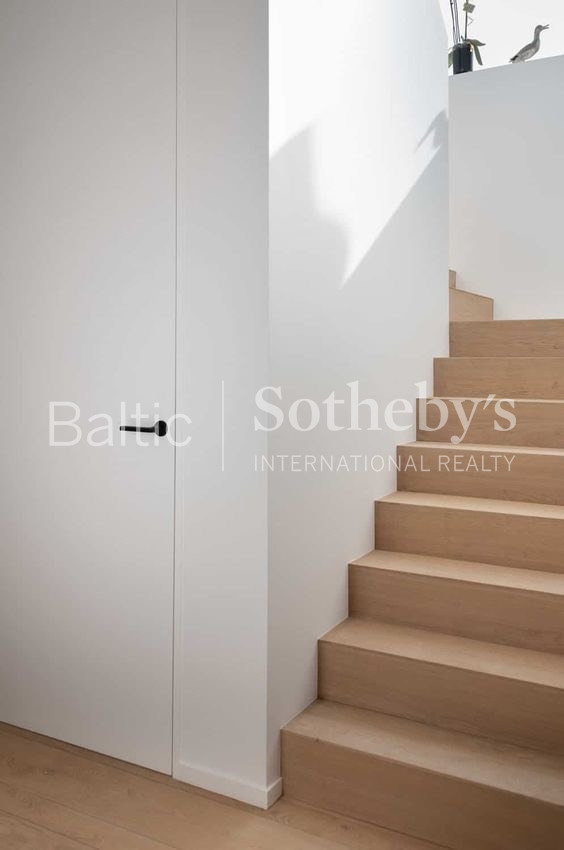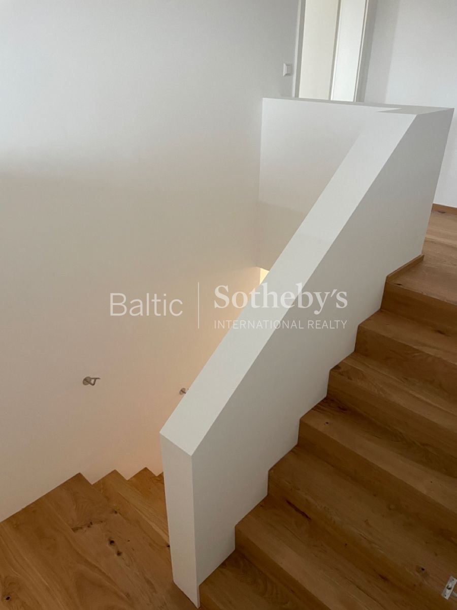 Pirmame aukšte – erdvė, kurioje darniai susilieja svetainė, valgomasis ir virtuvė. Šiuolaikinis dizainas, natūralios interjere naudojamos medžiagos ir pastelinių atspalvių paletė kuria jaukią, minimalistinę atmosferą. Vitrininiai langai atveria vaizdą į pušyną, todėl net ir būdami viduje išlaikote ryšį su gamta. Moderni virtuvė su sala yra ne tik kulinarinių atradimų, bet ir bendravimo vieta, o iš čia atsiveria galimybė išeiti į 24 m² terasą – idealią rytinei kavai, šeimos pietums ar ilgiems vasaros vakarams susirangius su pledu po atviru dangumi.