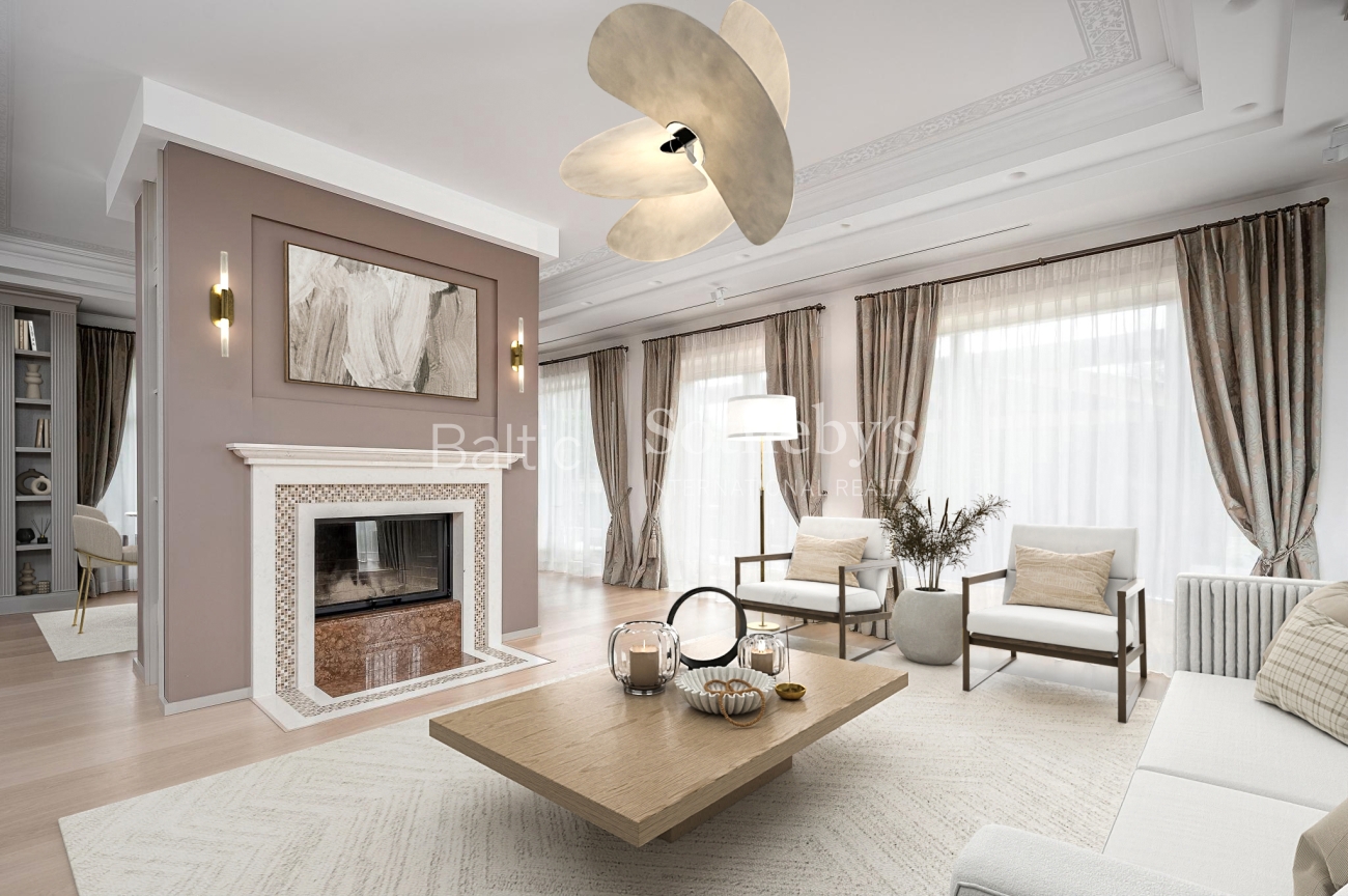 Pagrindinio namo viduje – 4 šviesūs miegamieji, 3 vonios kambariai, erdvi svetainės ir valgomojo zona, kurią simboliškai skiria židinys. Vokiška virtuvė su „Miele“ buitine technika pasižymi aukšta kokybe ir funkcionalumu. Korpusinius baldus kūrė „Virūna“, o minkšti baldai – itališki, kaip ir daugelis subtilių interjero akcentų, kurie atskleidžia nepriekaištingą skonį ir išbaigtą estetiką. Visas interjeras alsuoja klasikinio stiliaus prabanga ir harmonija, kurią papildo šviesių atspalvių paletė, natūralios medžiagos bei elegantiški dekoro sprendimai.