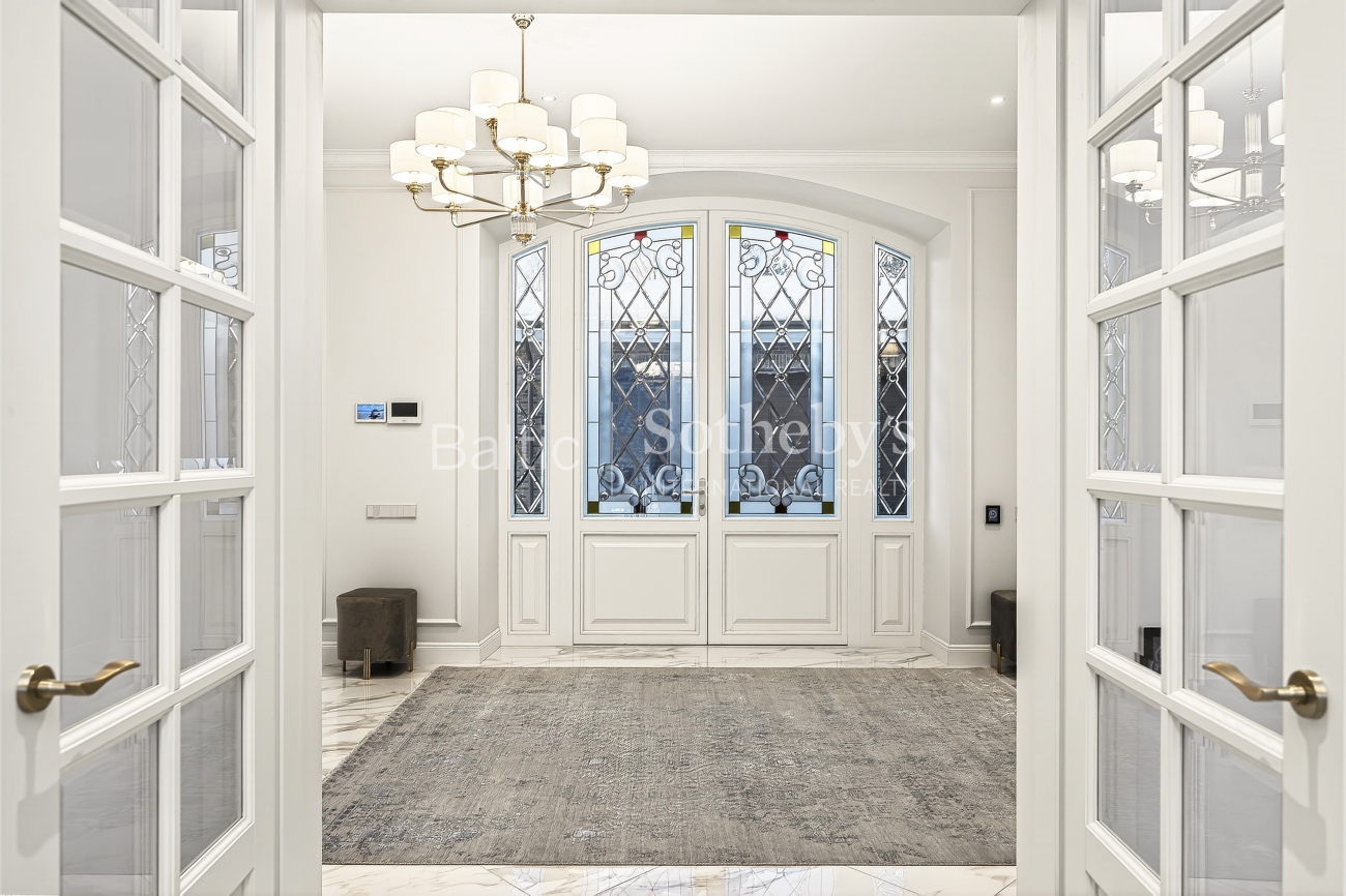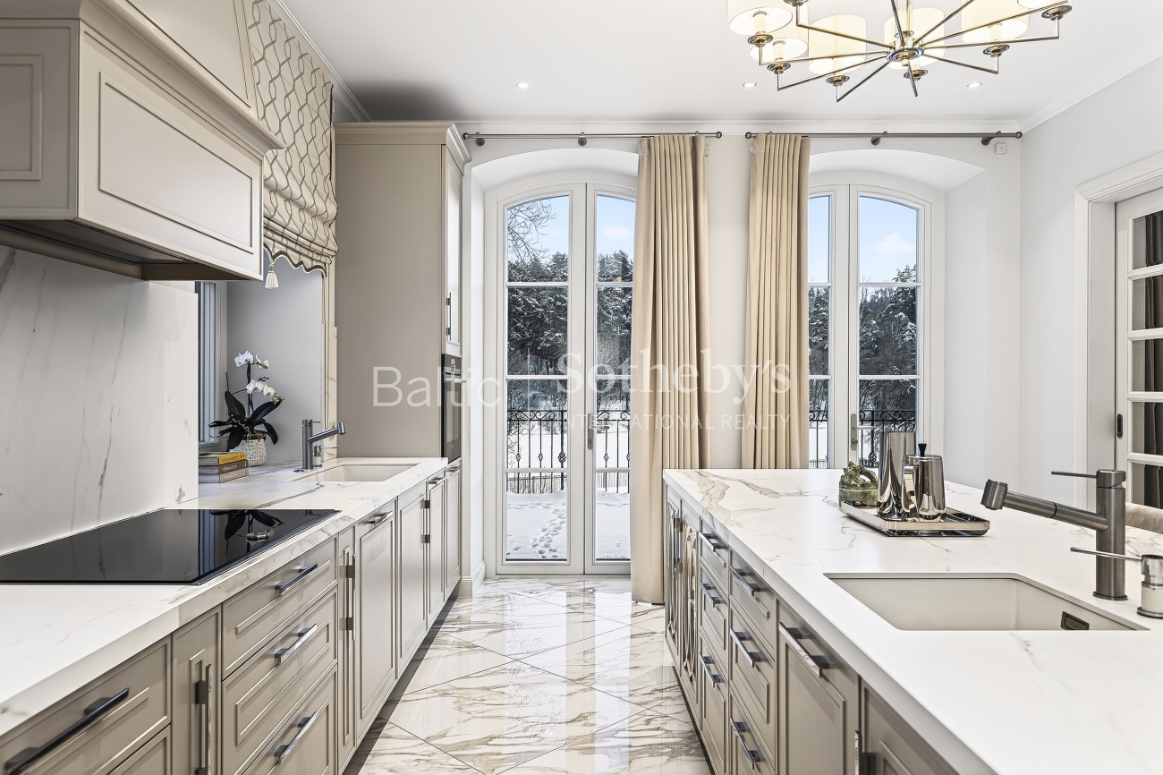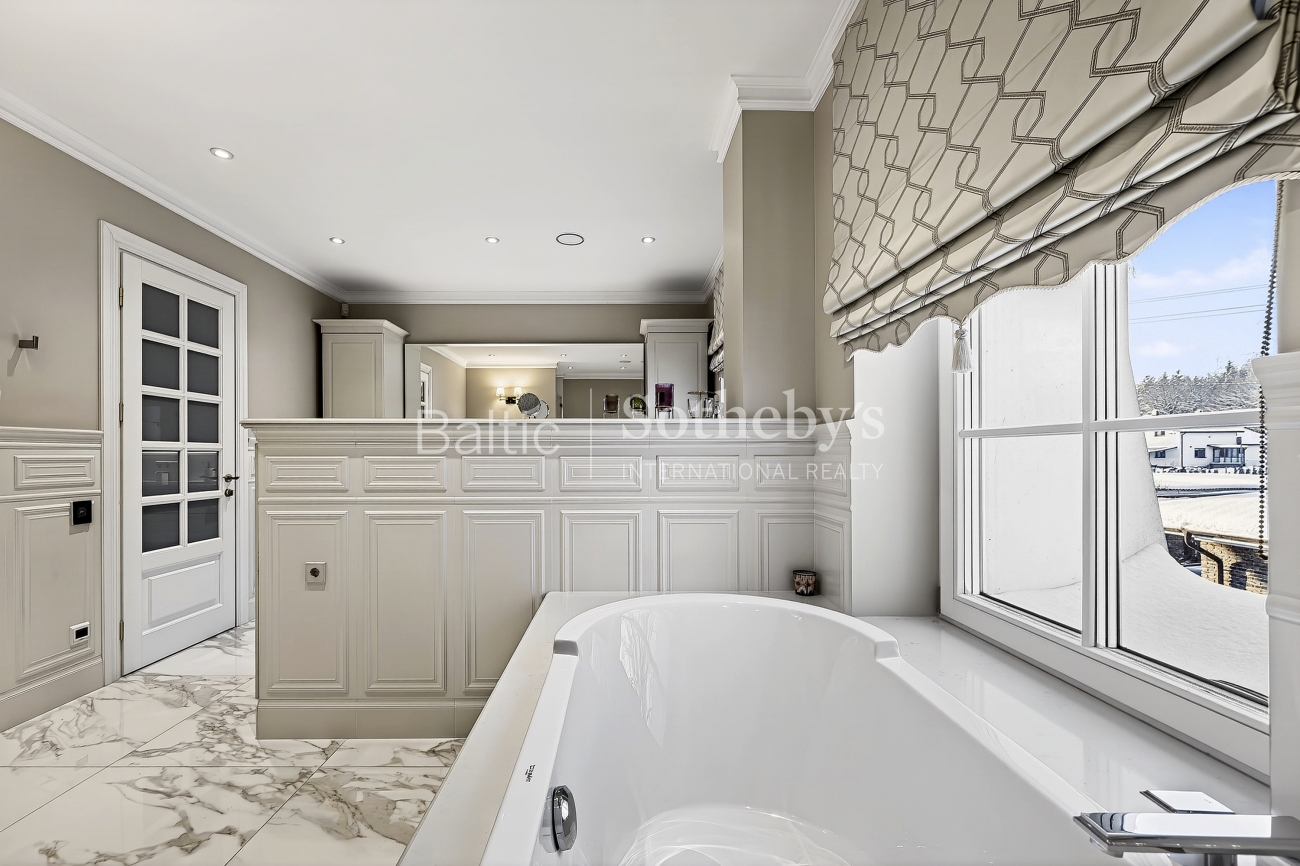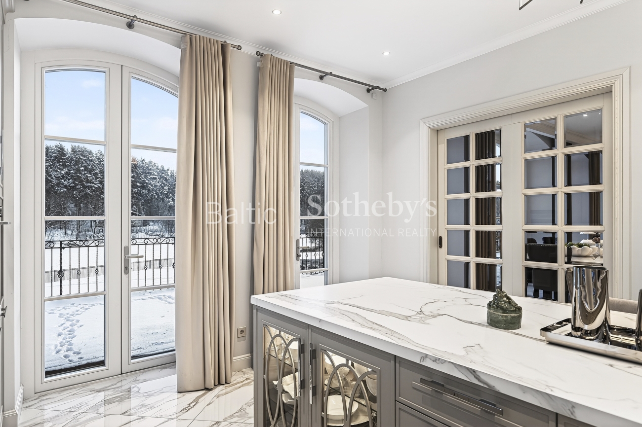 Objekte atsiskleidžia skambios ir elegantiškos architektūrinės detalės: vitražu dekoruotos lauko durys, grakščių linijų laiptai, arkiniai langai. „J. P. interjero namų“ kurtas prabangus interjeras subtiliai papildo šias architektūrines formas.