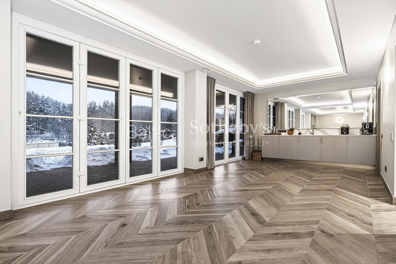 Pirmajame aukšte įrengta erdvi virtuvė su didele sala ir atskiru įeinamu sandėliuku. Svetainė ir valgomasis, iš kurių atsiveria Neries slėnio panorama, yra kupini šviesos ir saulės. Čia taip pat įrengtas darbo kambarys.