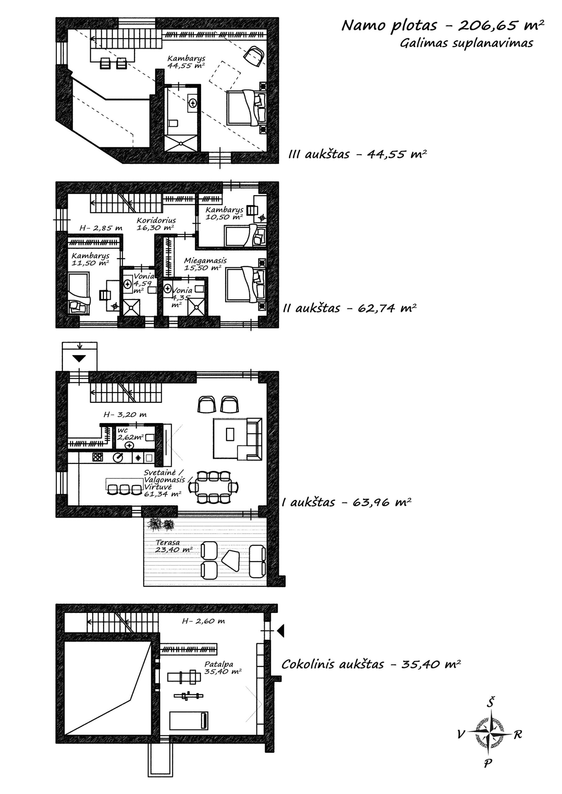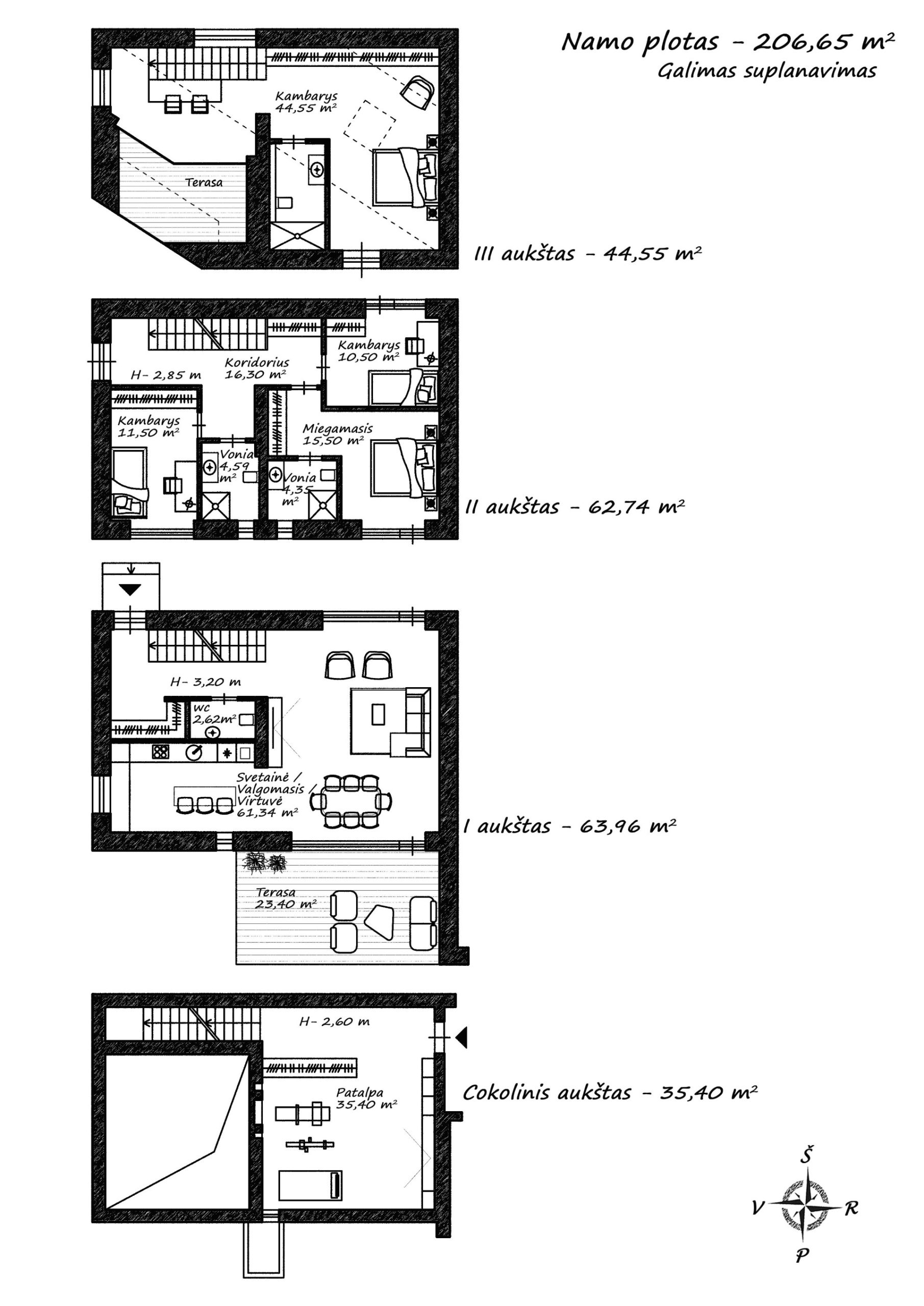 Namai išplanuoti per kelis aukštus. Suprojektuotas patogus patekimas tiesiai iš požeminio stovėjimo aikštelės.