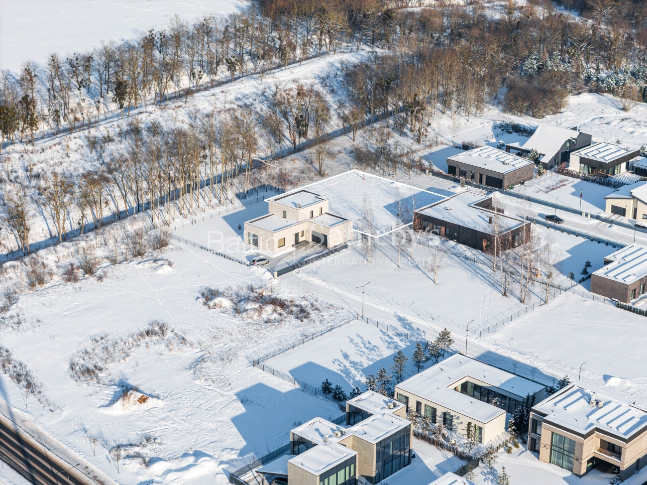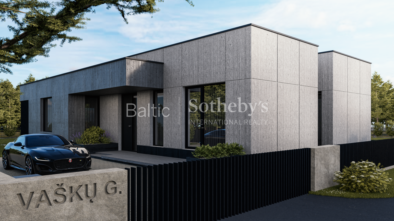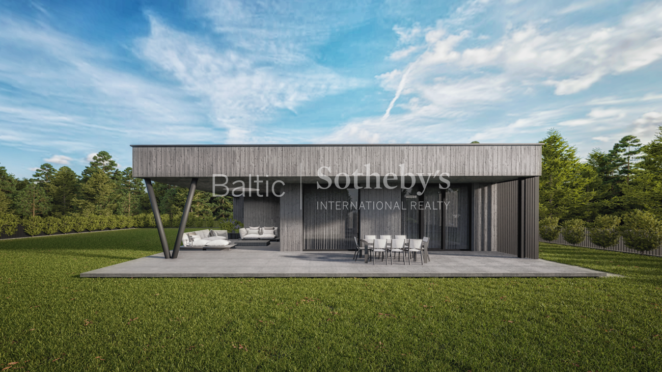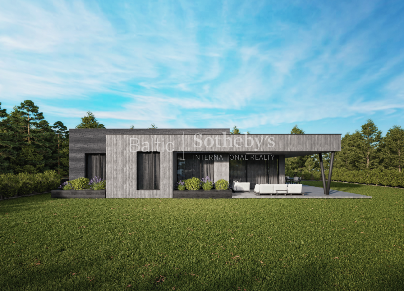 Sklypas parduodamas su parengtu vieno aukšto 152,68 kv. m namo projektu ir išduotu statybos leidimu. Namas suplanuotas funkcionaliai – trys miegamieji, erdvi svetainė su virtuve, pagalbinės patalpos. Pastato tūriai – du tarpusavyje derantys kubai, o fasado dekorui naudojamos šviesios medinės lentos ir tamsios klinkerio plytos.