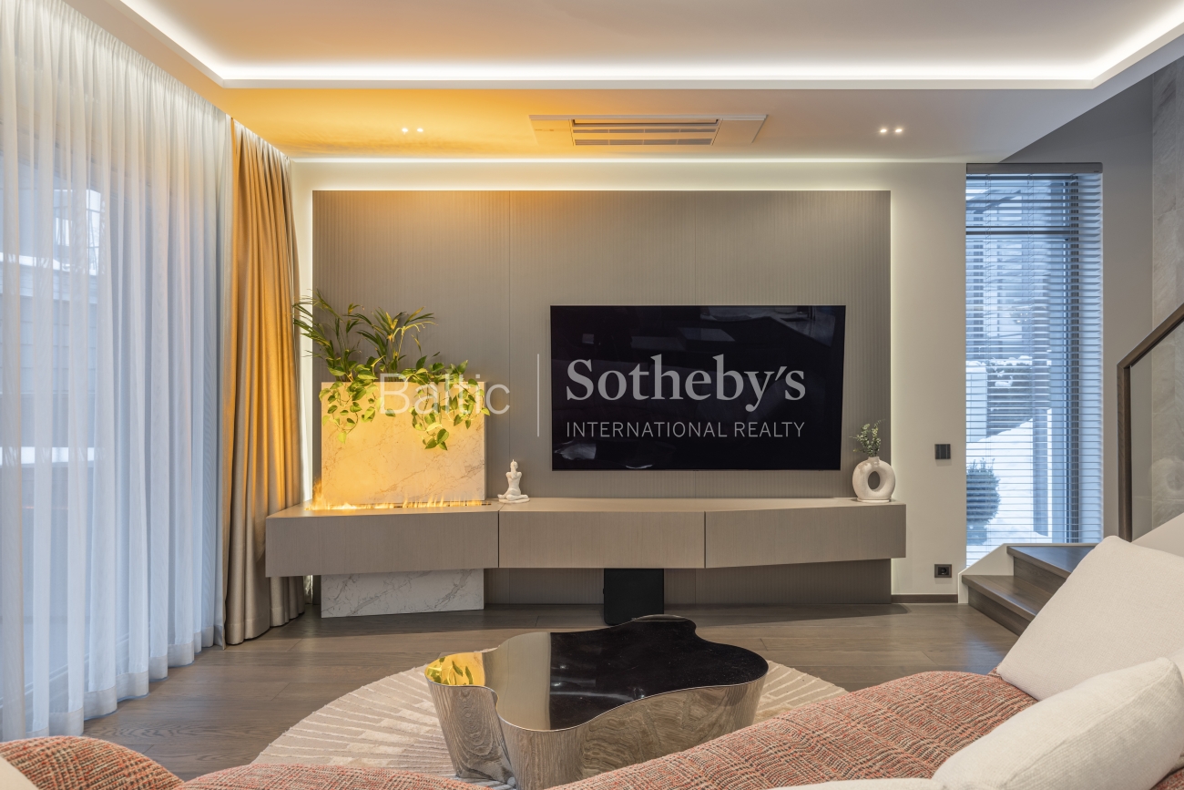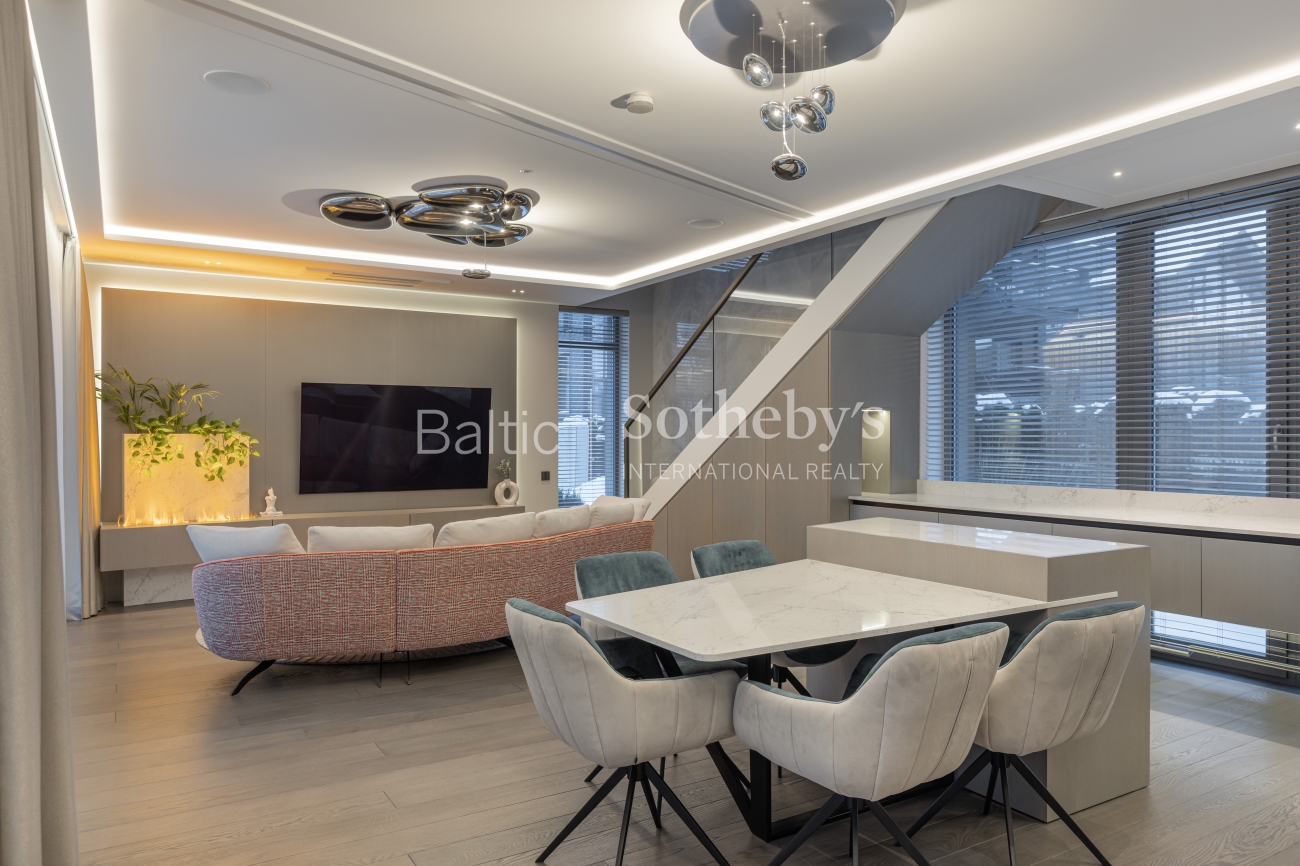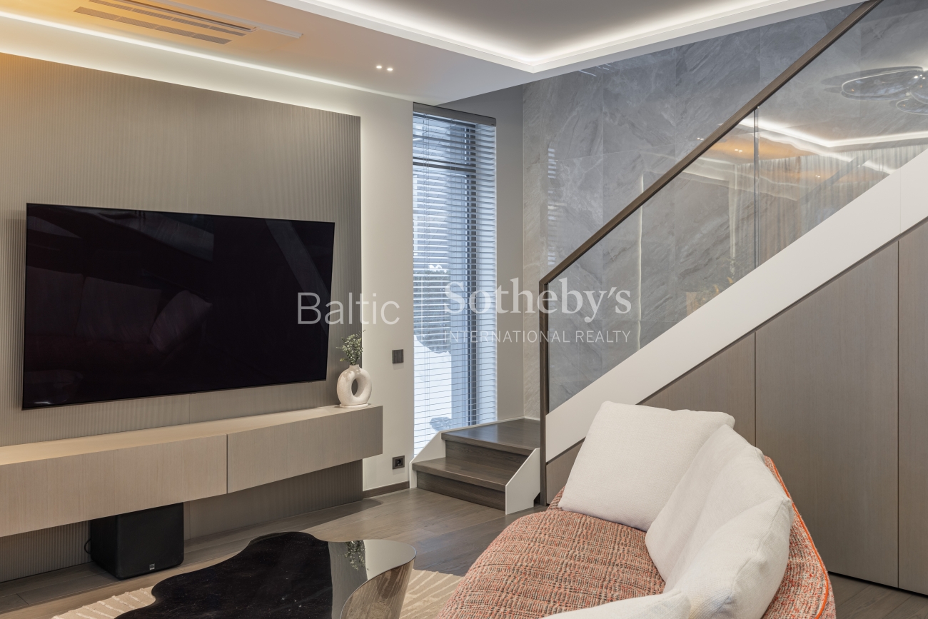 Интерьер производит впечатление тщательно подобранными материалами и мебелью, изготовленной на заказ. Полы выложены отборным дубовым паркетом без сучков, уникальная лестница из ясеня, а ванных комнатах – керамическая плитка. Кухня привлекает внимание кварцевыми столешницами из «Technistone Calacatta Olympos», а мебель из МДФ органично вписывается в общую концепцию интерьера. В ТВ-тумбе изысканно встроена элегантная отделка из камня с современным камином с функцией пара, который не только создает уют, но и служит увлажнителем воздуха. Гостиная обставлена итальянской мебелью, такой как диван «MX Sipario», стол от «Eichholtz» и светильники «Artemide Skydro», создавая гармоничное и роскошное впечатление во всем доме.