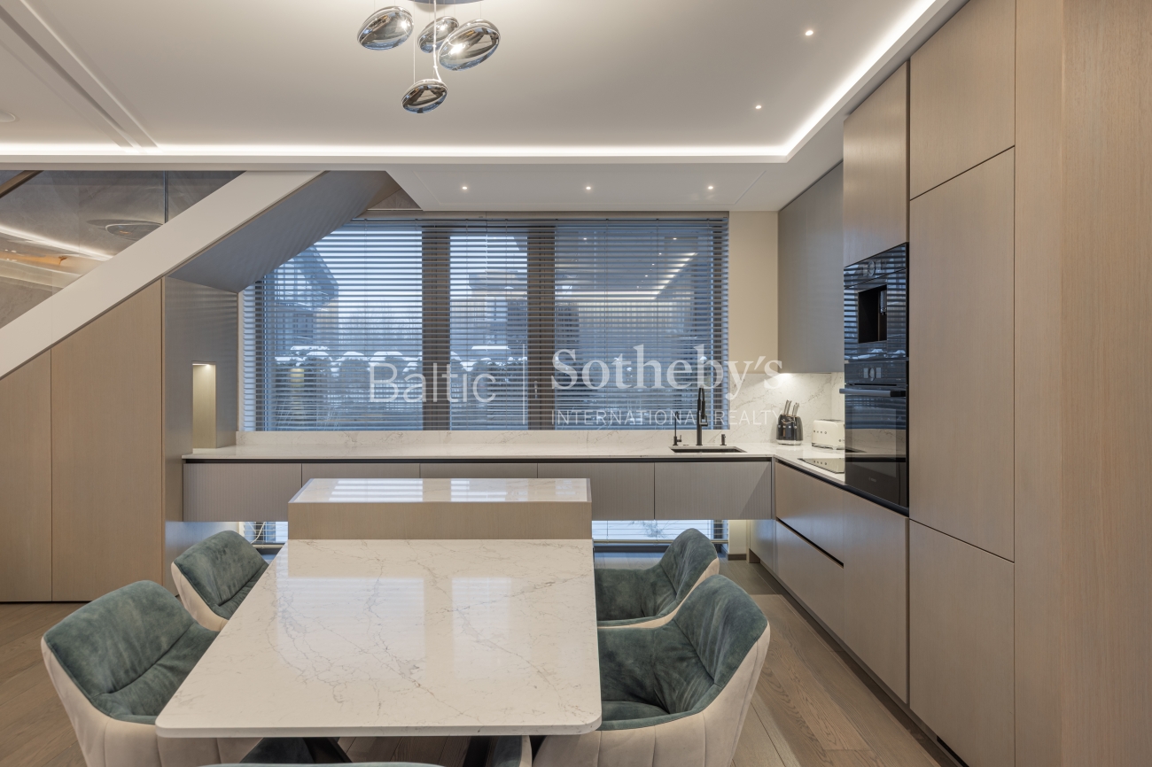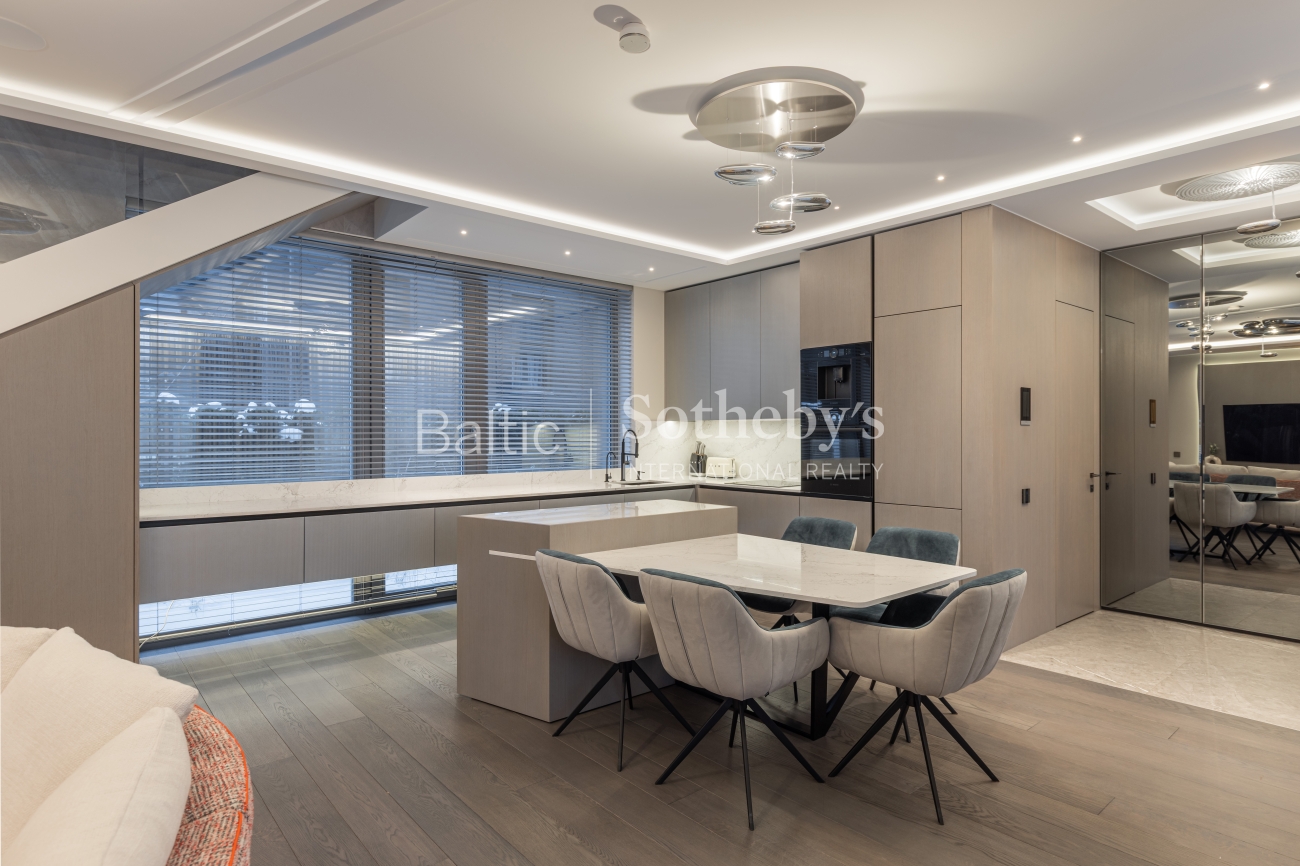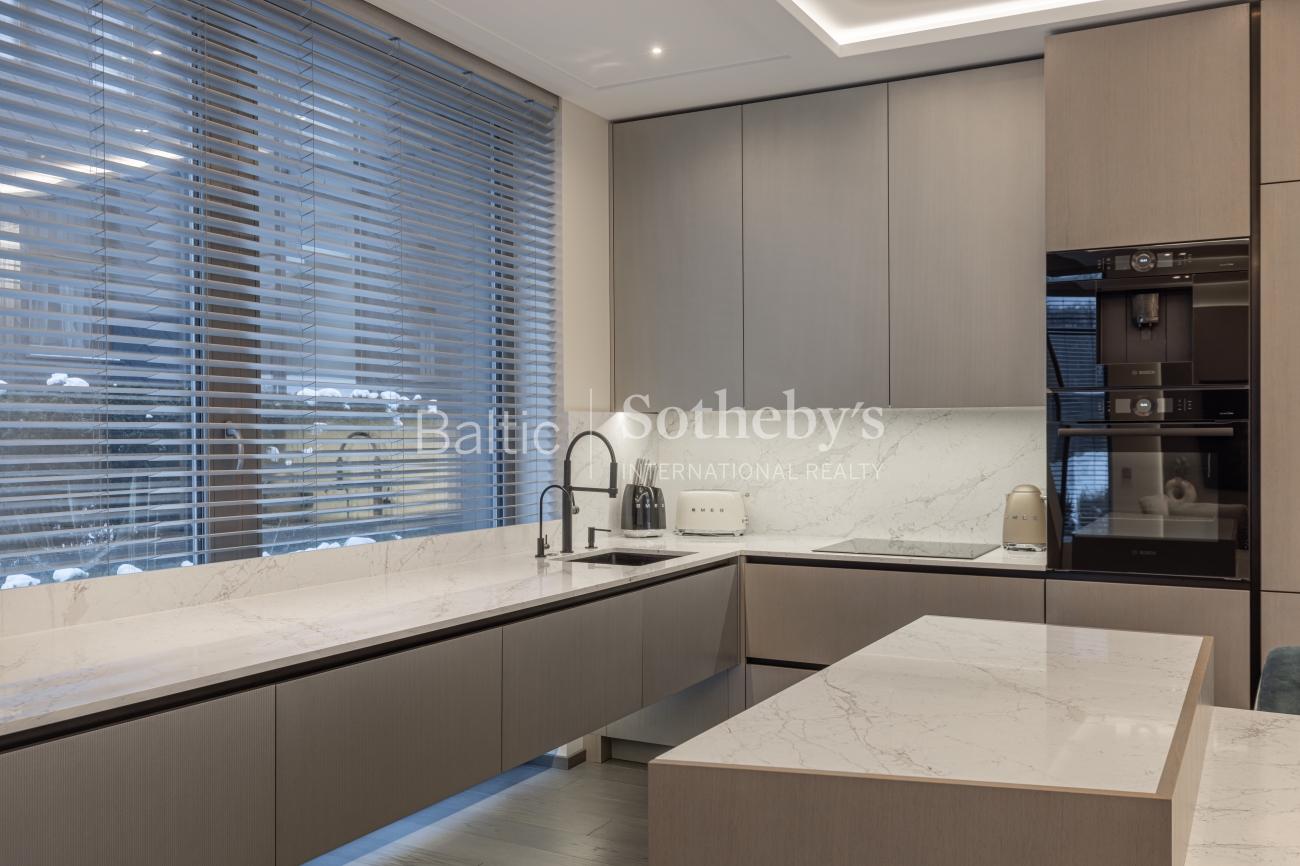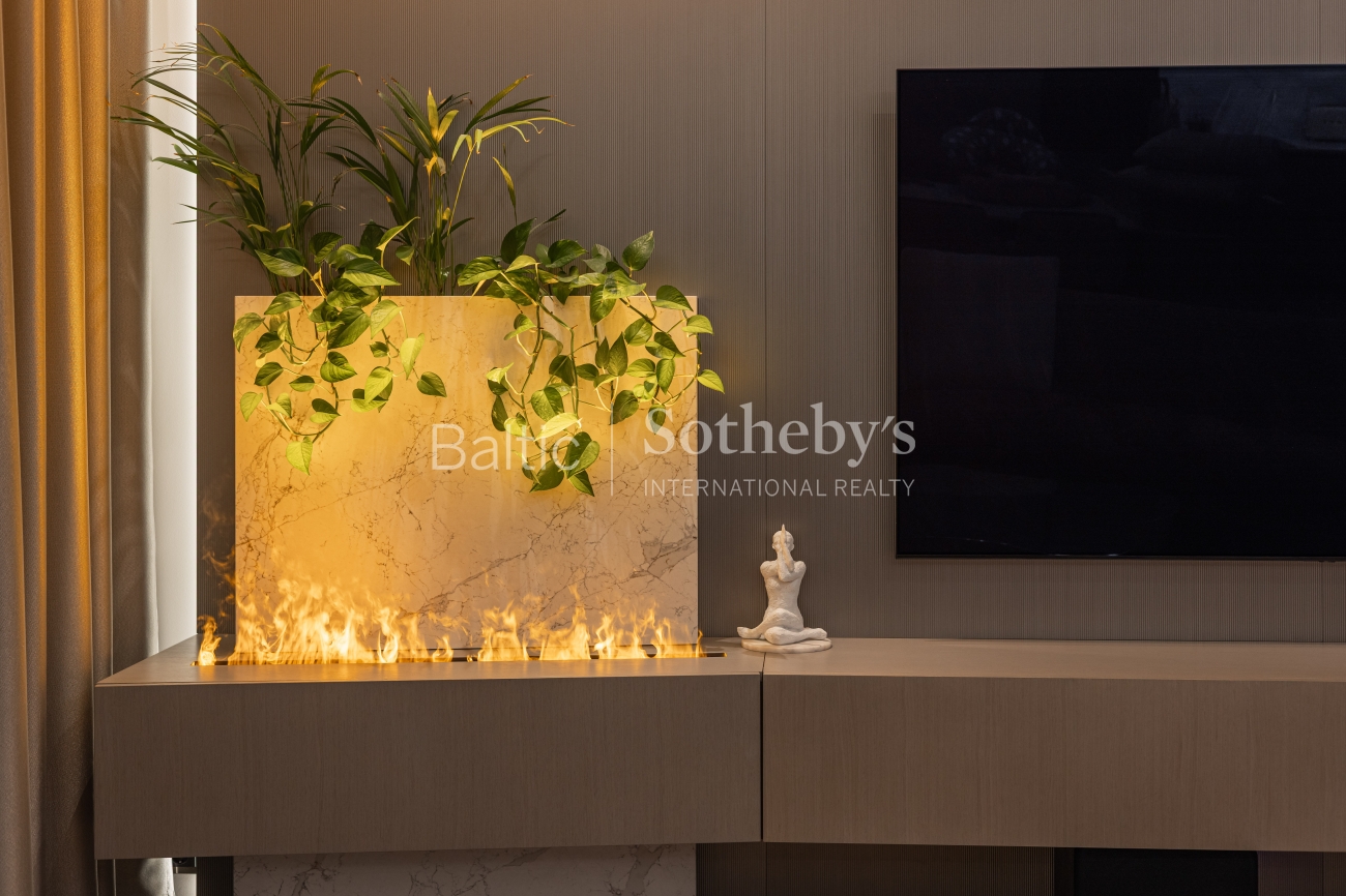 Интерьер производит впечатление тщательно подобранными материалами и мебелью, изготовленной на заказ. Полы выложены отборным дубовым паркетом без сучков, уникальная лестница из ясеня, а ванных комнатах – керамическая плитка. Кухня привлекает внимание кварцевыми столешницами из «Technistone Calacatta Olympos», а мебель из МДФ органично вписывается в общую концепцию интерьера. В ТВ-тумбе изысканно встроена элегантная отделка из камня с современным камином с функцией пара, который не только создает уют, но и служит увлажнителем воздуха. Гостиная обставлена итальянской мебелью, такой как диван «MX Sipario», стол от «Eichholtz» и светильники «Artemide Skydro», создавая гармоничное и роскошное впечатление во всем доме.