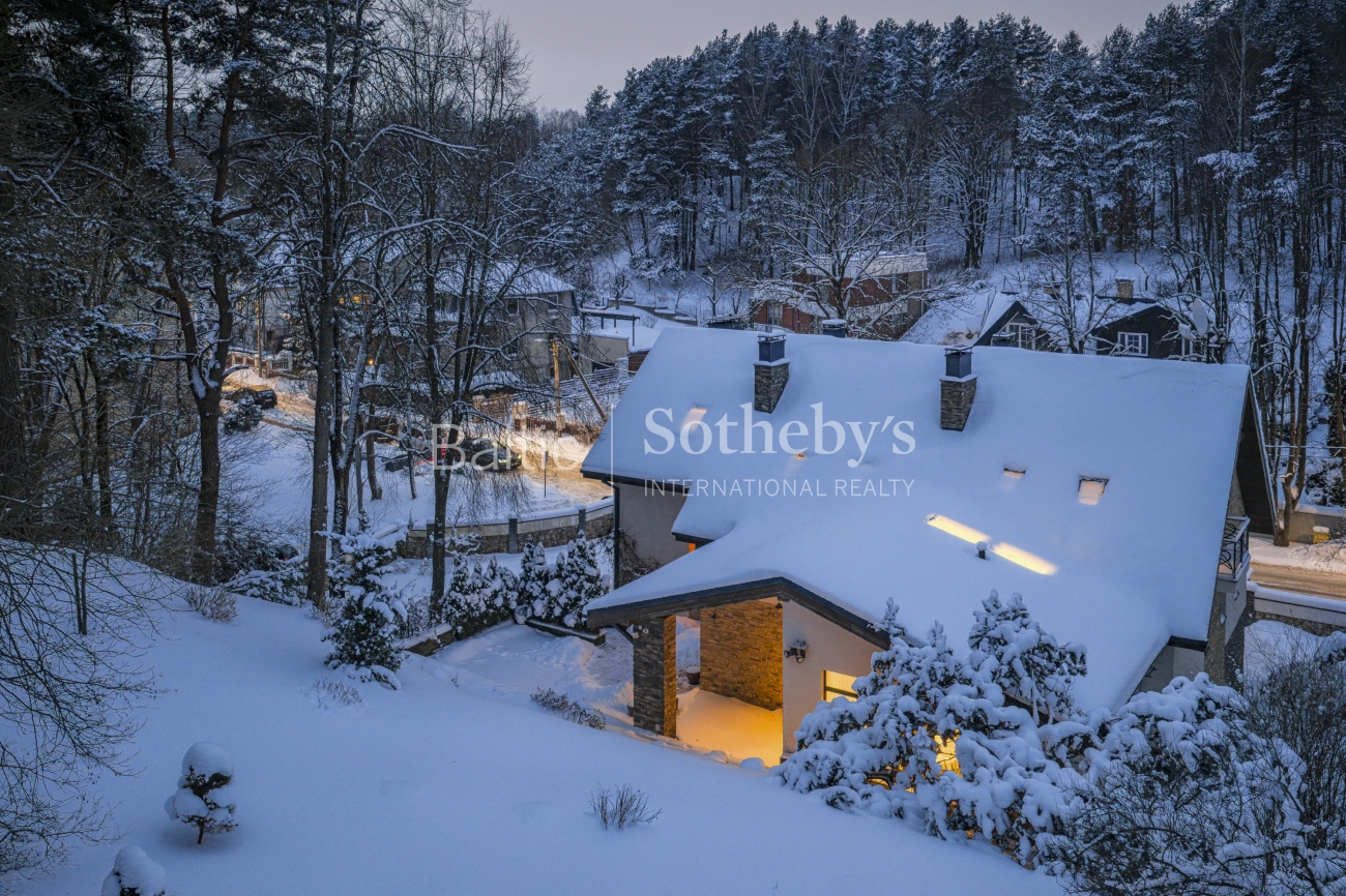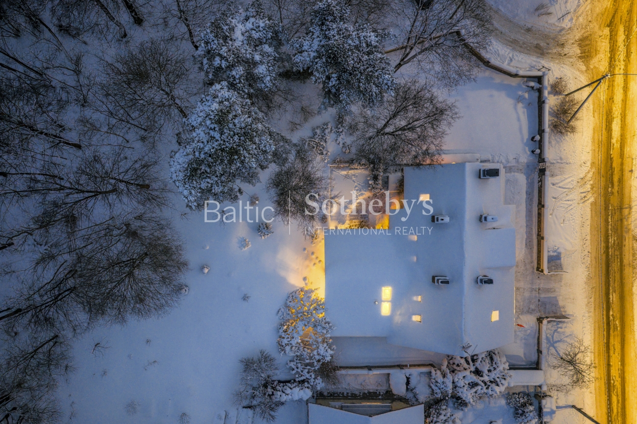 Рядом с гостиной расположены рабочий кабинет и гостевая комната, столовая в классическом стиле и роскошная кухня с просторной островной зоной, современной бытовой техникой и витринами, выходящими в ухоженный частный сад. Две террасы, окруженные взрослыми деревьями и декоративными растениями, создают оазис спокойствия, где повседневность переплетается с эстетикой природы – утренний кофе, книга в тени или уютные вечера с барбекю становятся ритуалами. Угловой участок площадью 10,61 а, граничащий с зеленым лесом, дает неоценимую ценность – ощущение уединения и близости к природе в центре города.