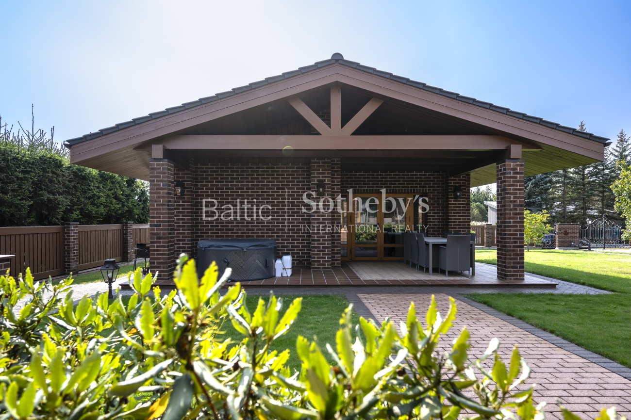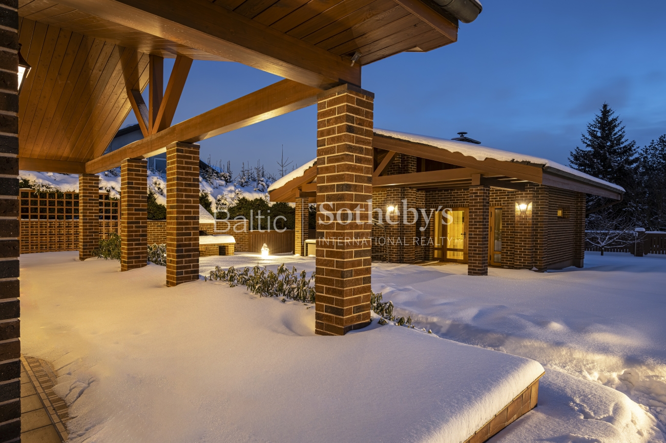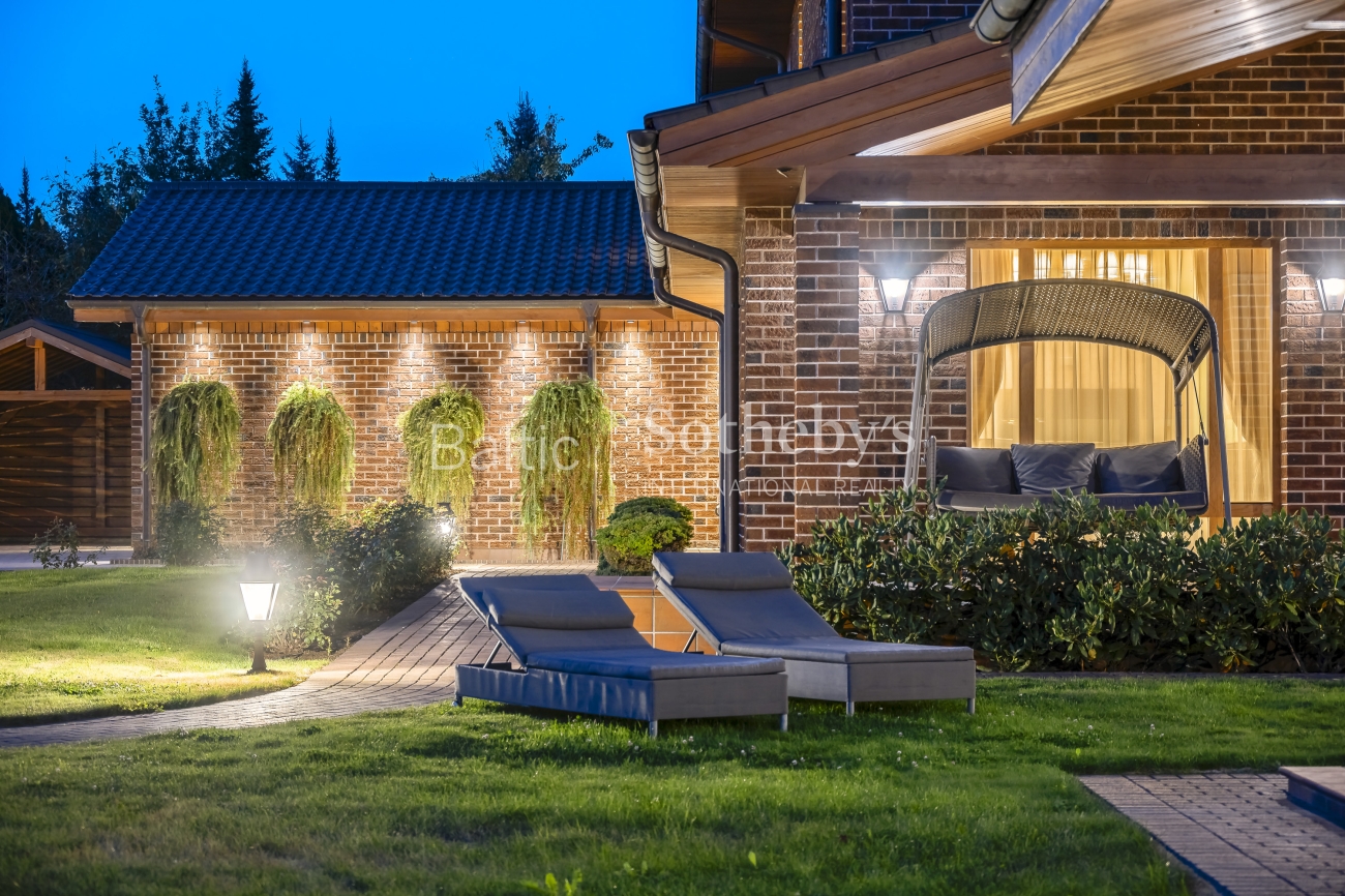 Inside the main house, there are 4 bright bedrooms, 3 bathrooms, and a spacious living and dining area symbolically divided by a fireplace. The German kitchen equipped with Miele appliances stands out for its high quality and functionality. The built-in furniture was custom-made by Virūna, while the soft furnishings are Italian—as are many of the refined interior accents that reflect impeccable taste and a sense of complete aesthetic harmony. The interior radiates classic luxury, enhanced by a palette of light tones, natural materials, and elegant decorative solutions.