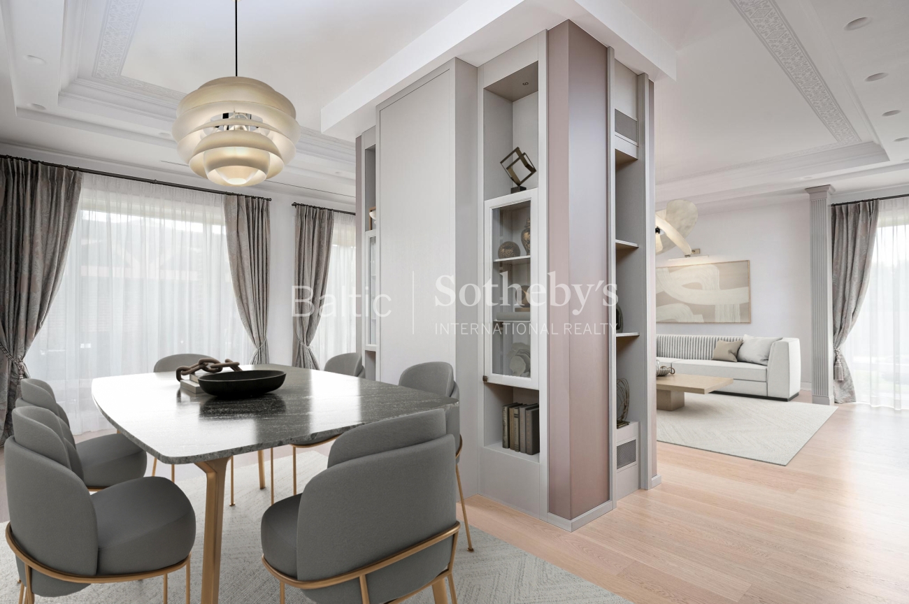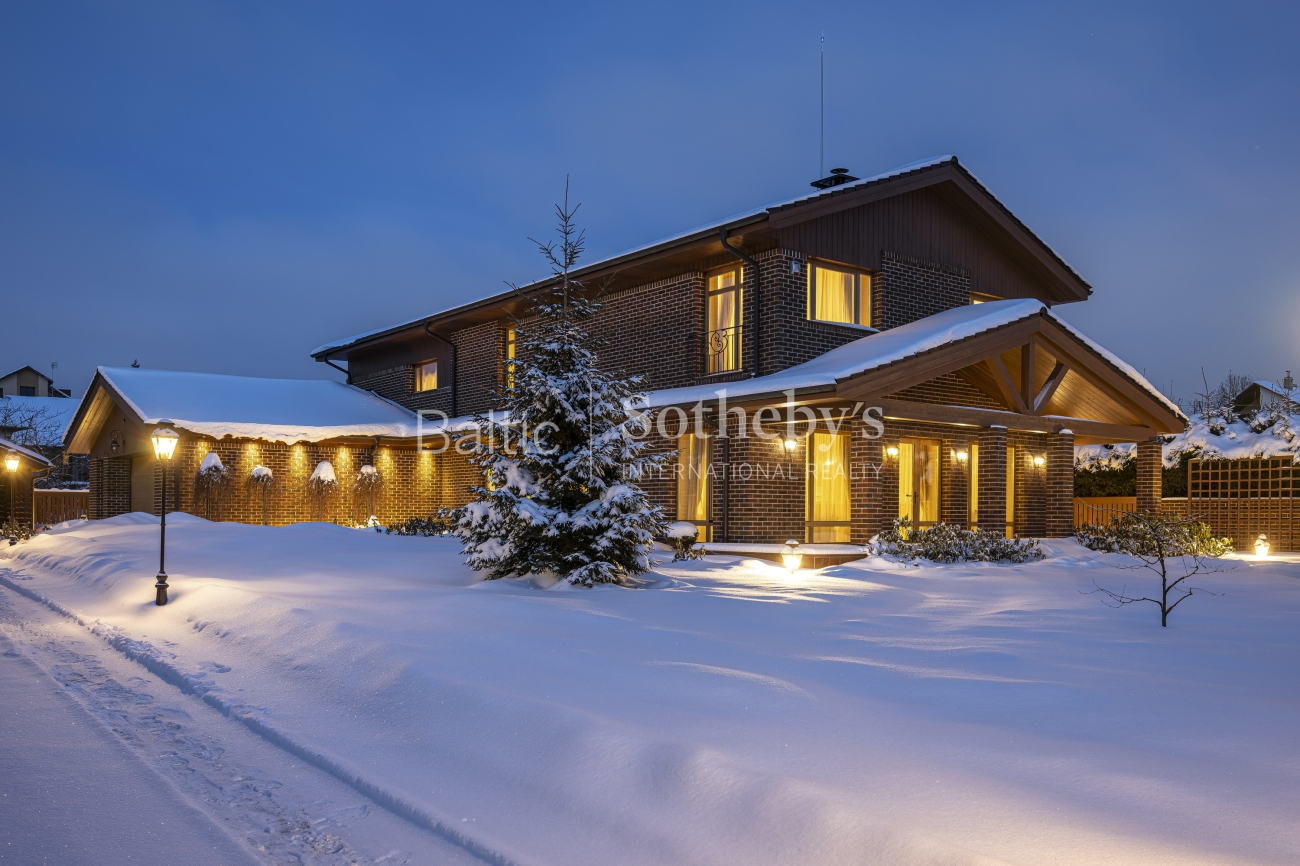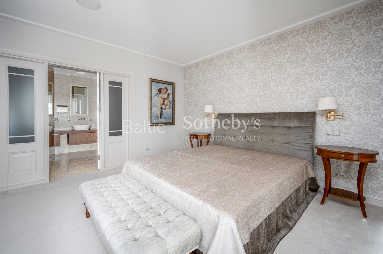 Inside the main house, there are 4 bright bedrooms, 3 bathrooms, and a spacious living and dining area symbolically divided by a fireplace. The German kitchen equipped with Miele appliances stands out for its high quality and functionality. The built-in furniture was custom-made by Virūna, while the soft furnishings are Italian—as are many of the refined interior accents that reflect impeccable taste and a sense of complete aesthetic harmony. The interior radiates classic luxury, enhanced by a palette of light tones, natural materials, and elegant decorative solutions.