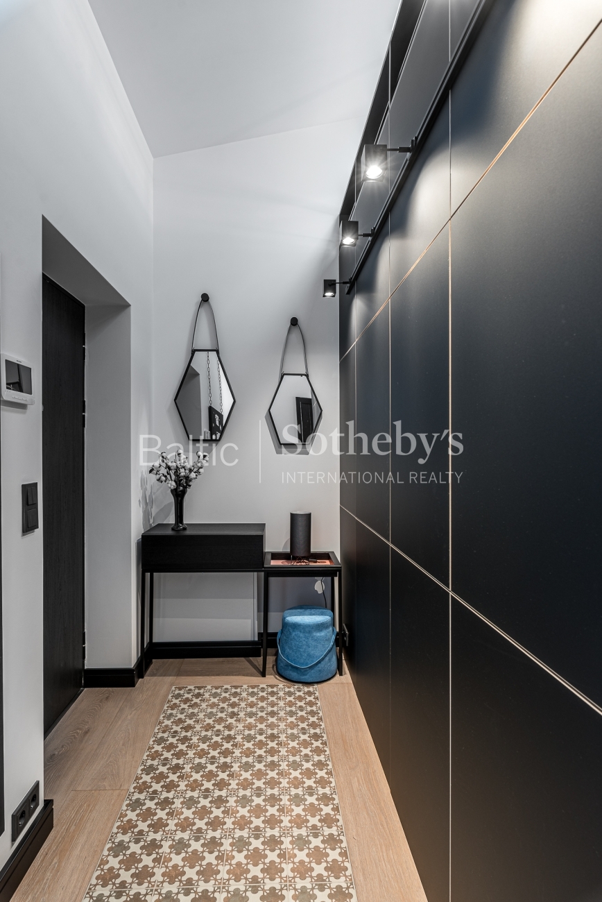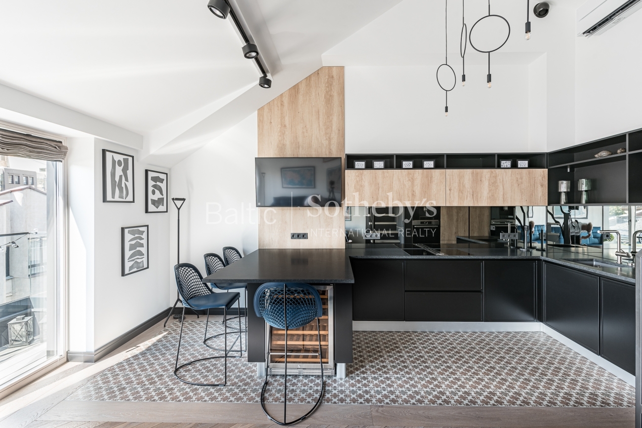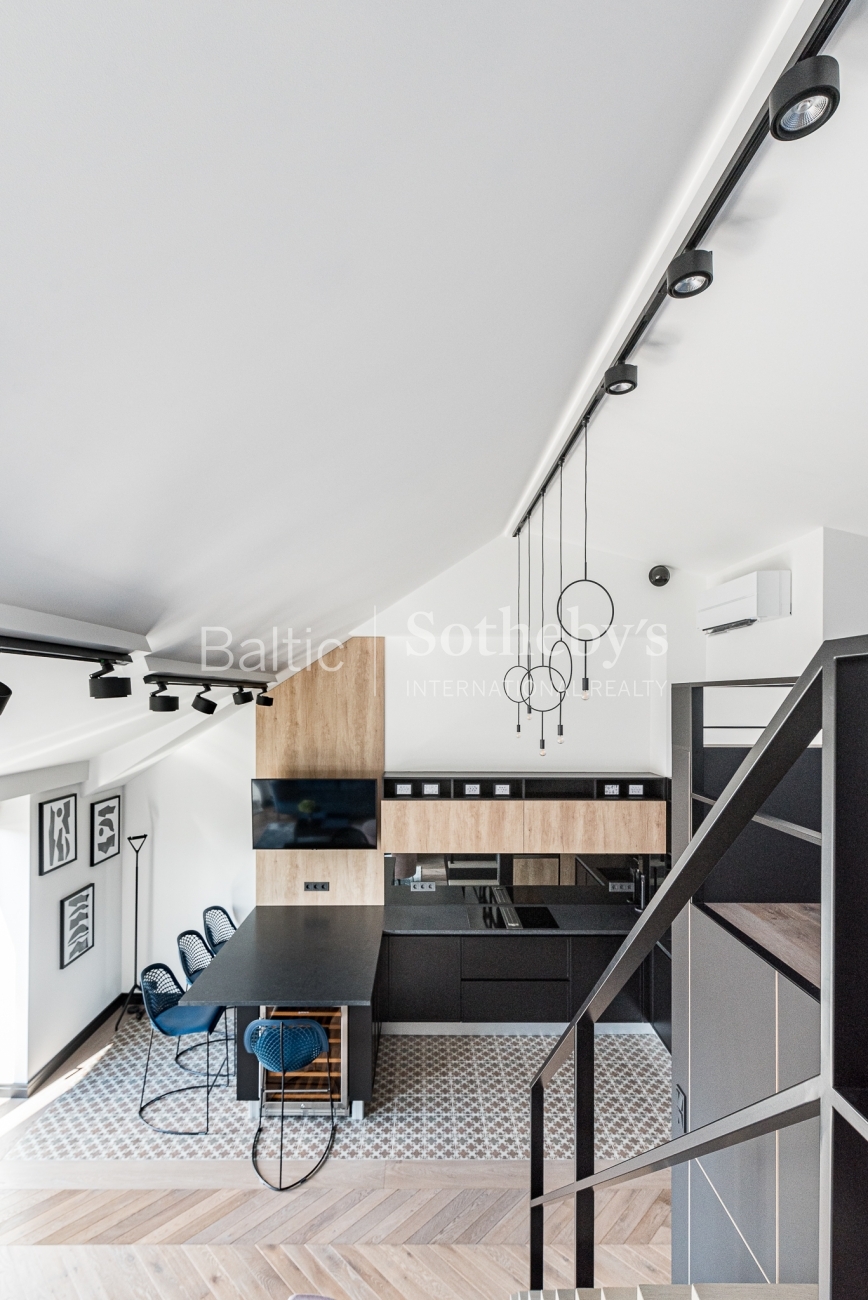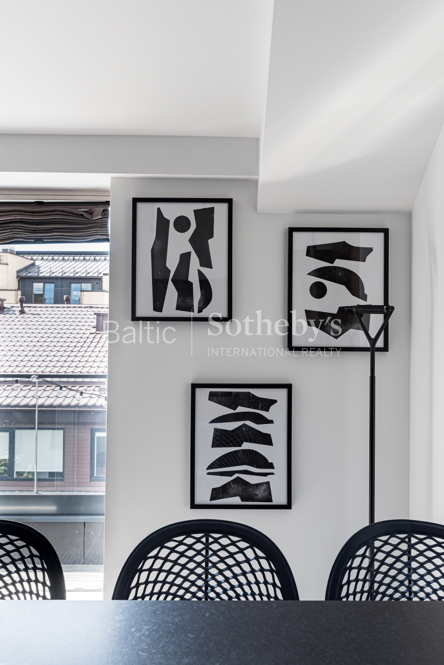 Дизайнер проживающая в столице Австрии Вене, в сердце Вильнюса создала дом, радующий своей функциональностью и чарующий качеством. В Старом городе, на последнем этаже дома 2018 года строительства дизайнер спроектировала большую кухню, полноценную зону отдыха гостиной, на антресоли – спальню с чердачным окном, из которого, лежа в кровати, можно любоваться на звезды. В прихожей, сто́ит только легко надавить на одну панель, открывается просторная и удобная гардеробная, а другая аналогичная спроектирована со стороны гостиной.