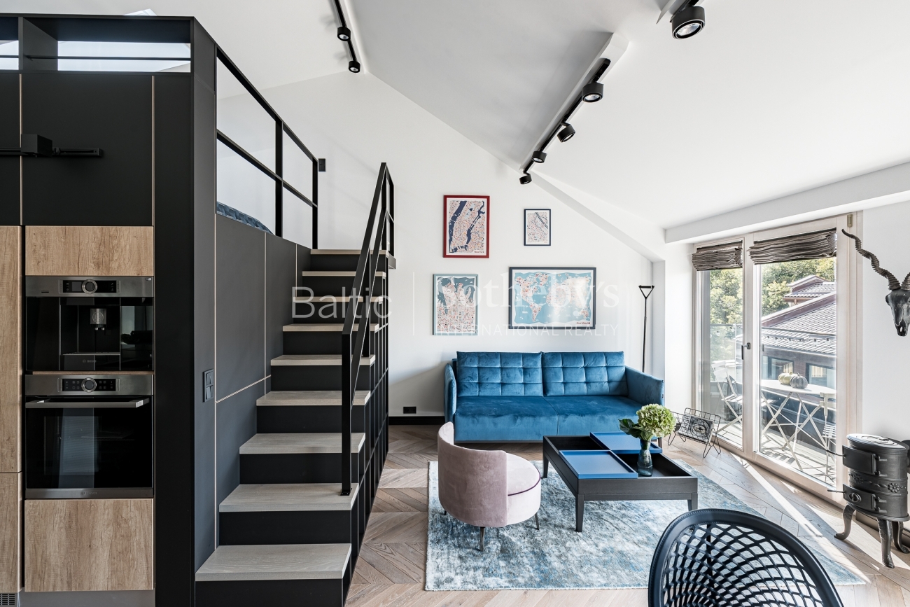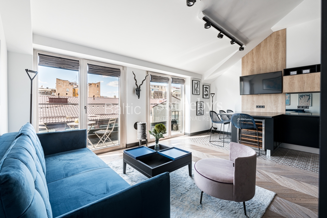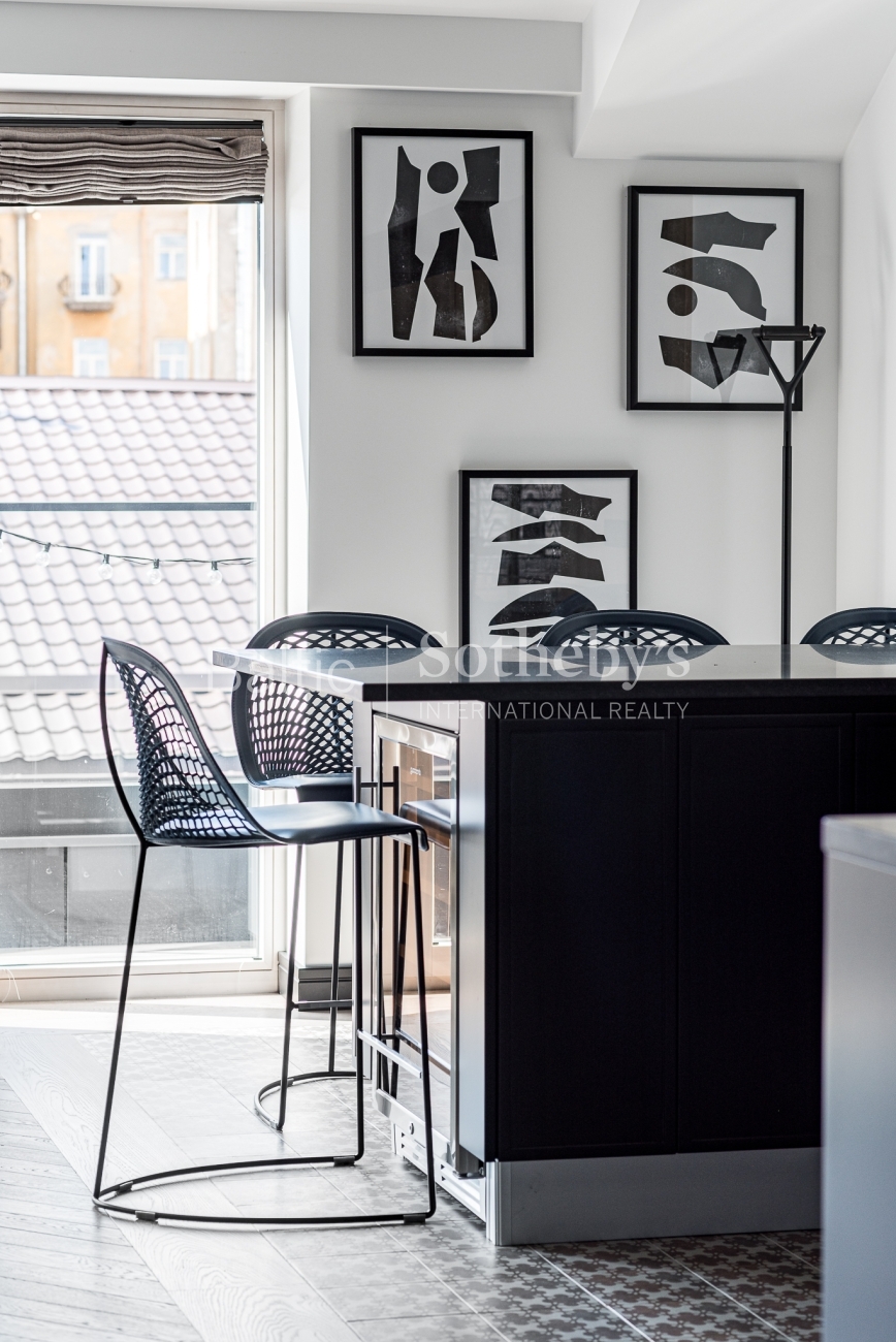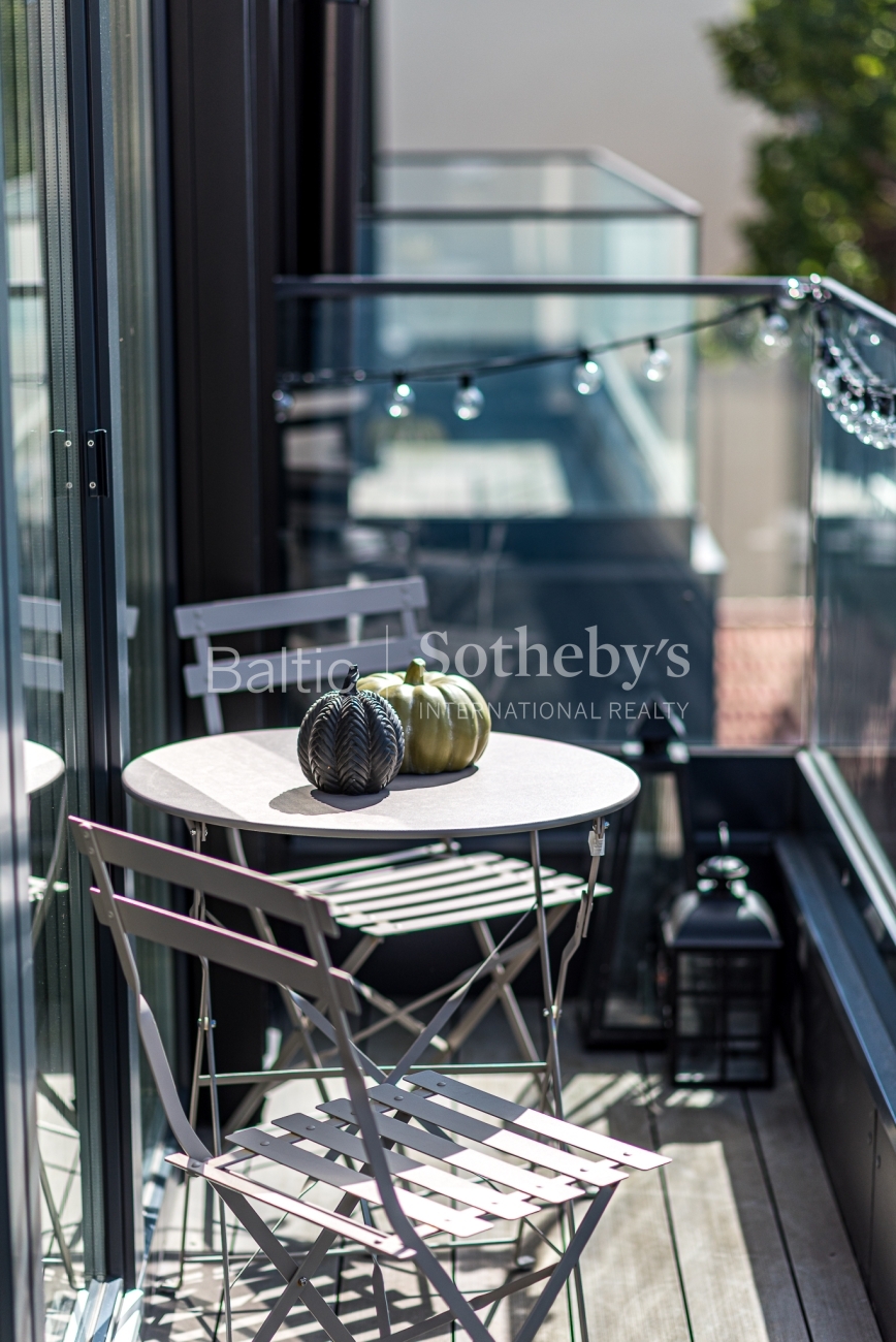 Дизайнер проживающая в столице Австрии Вене, в сердце Вильнюса создала дом, радующий своей функциональностью и чарующий качеством. В Старом городе, на последнем этаже дома 2018 года строительства дизайнер спроектировала большую кухню, полноценную зону отдыха гостиной, на антресоли – спальню с чердачным окном, из которого, лежа в кровати, можно любоваться на звезды. В прихожей, сто́ит только легко надавить на одну панель, открывается просторная и удобная гардеробная, а другая аналогичная спроектирована со стороны гостиной.
