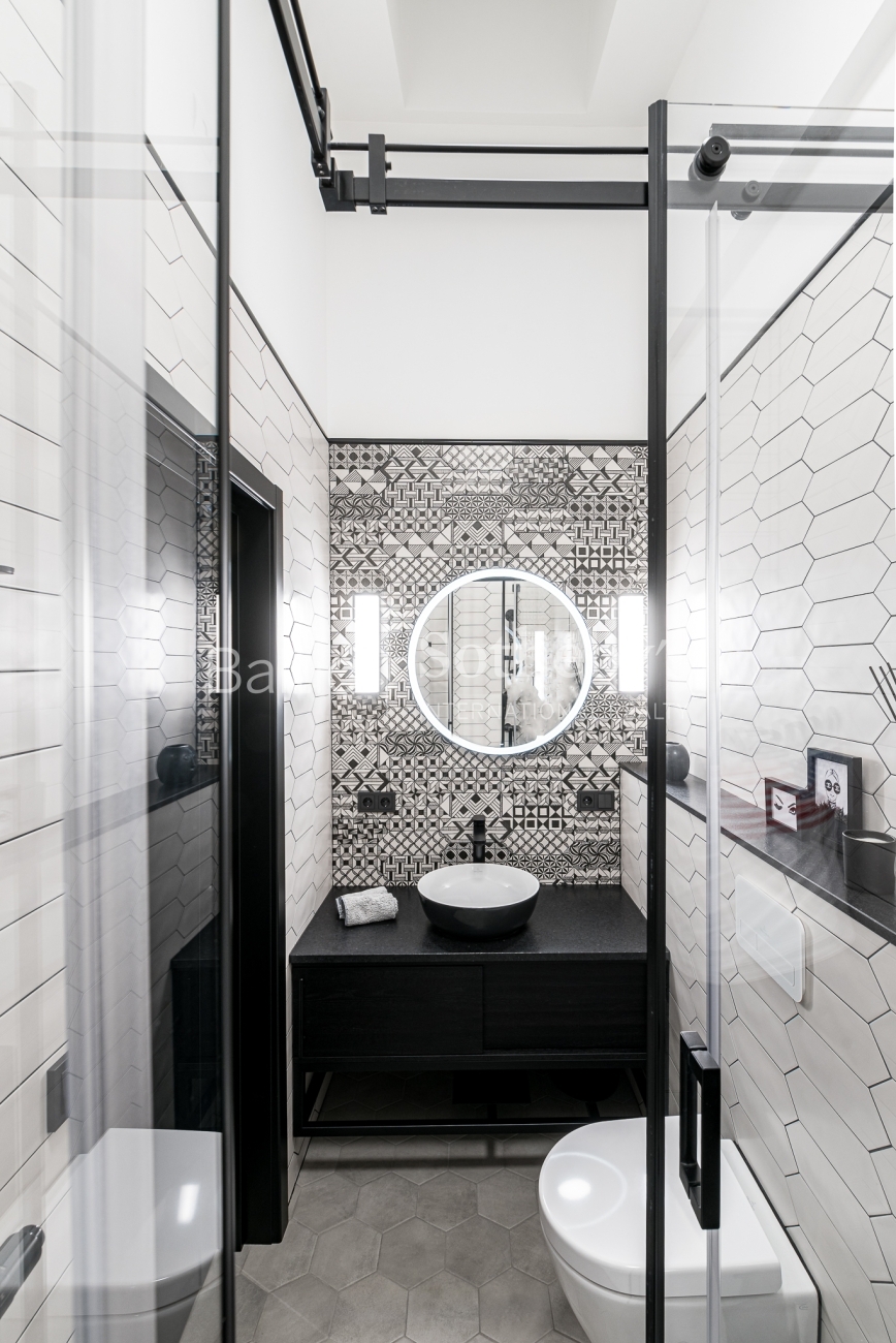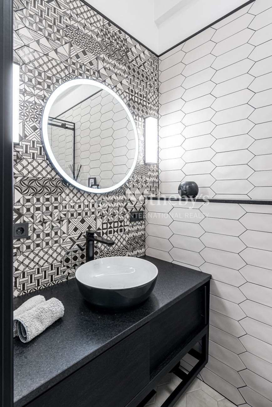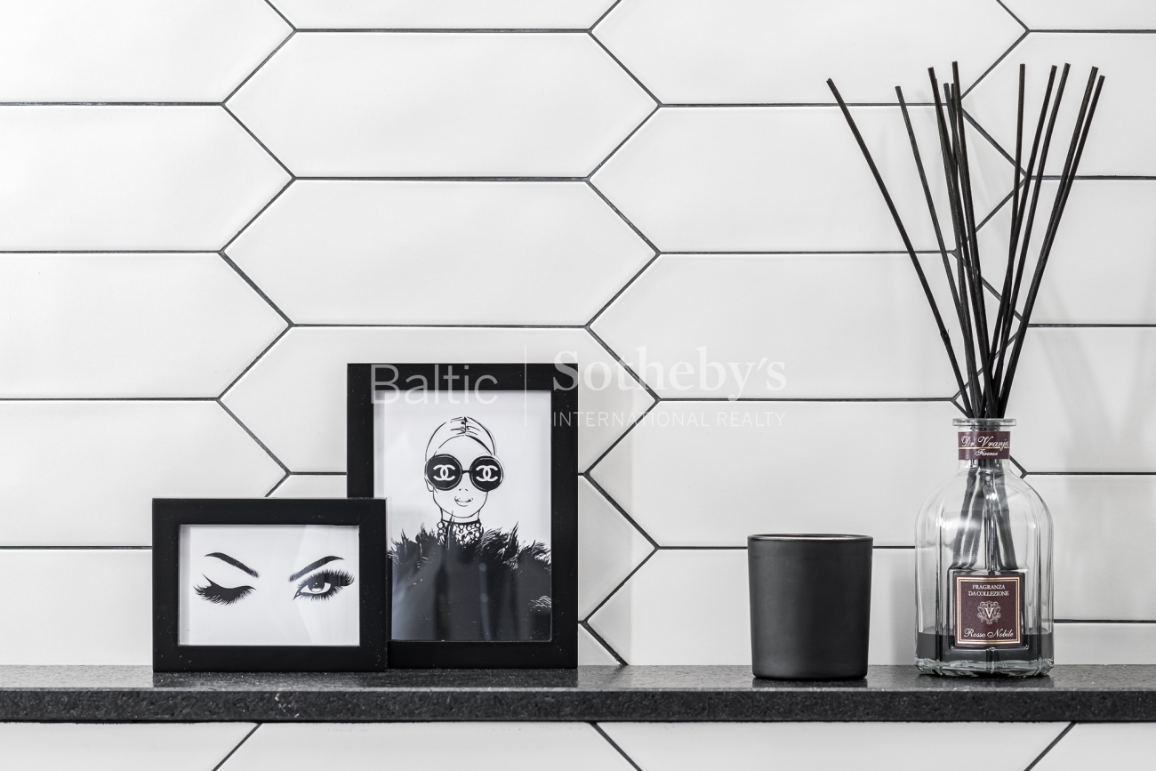 В доме площадью 54 кв. м всё не только продумано до мелочей, но и подобраны материалы высочайшего качества. Композиции интерьера тепла добавляет фактура дерева, которая красиво проявляется в сочетании со столешницей из черного гранита, поверхностью тонированного зеркала, черными фасадами кухни и конструкции. Для дома подобраны и приборы от лучших мировых изготовителей на все случаи жизни: кондиционер «Mitsubishi», холодильник «Liebherr», посудомоечная машина «Bosch», стиральная машина с сушкой «AEG», индукционная плита «Falmec Piano» с встроенной кухонной вытяжкой, холодильник для вина «Guzzanti», телевизор «Samsung». Это – дом, в который будет хорошо и удобно возвращаться после трудового дня, и который будет манить провести досуг в красивом вильнюсском Старом городе.