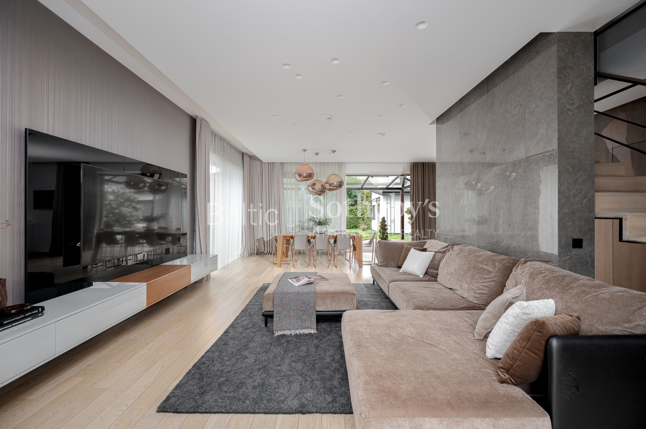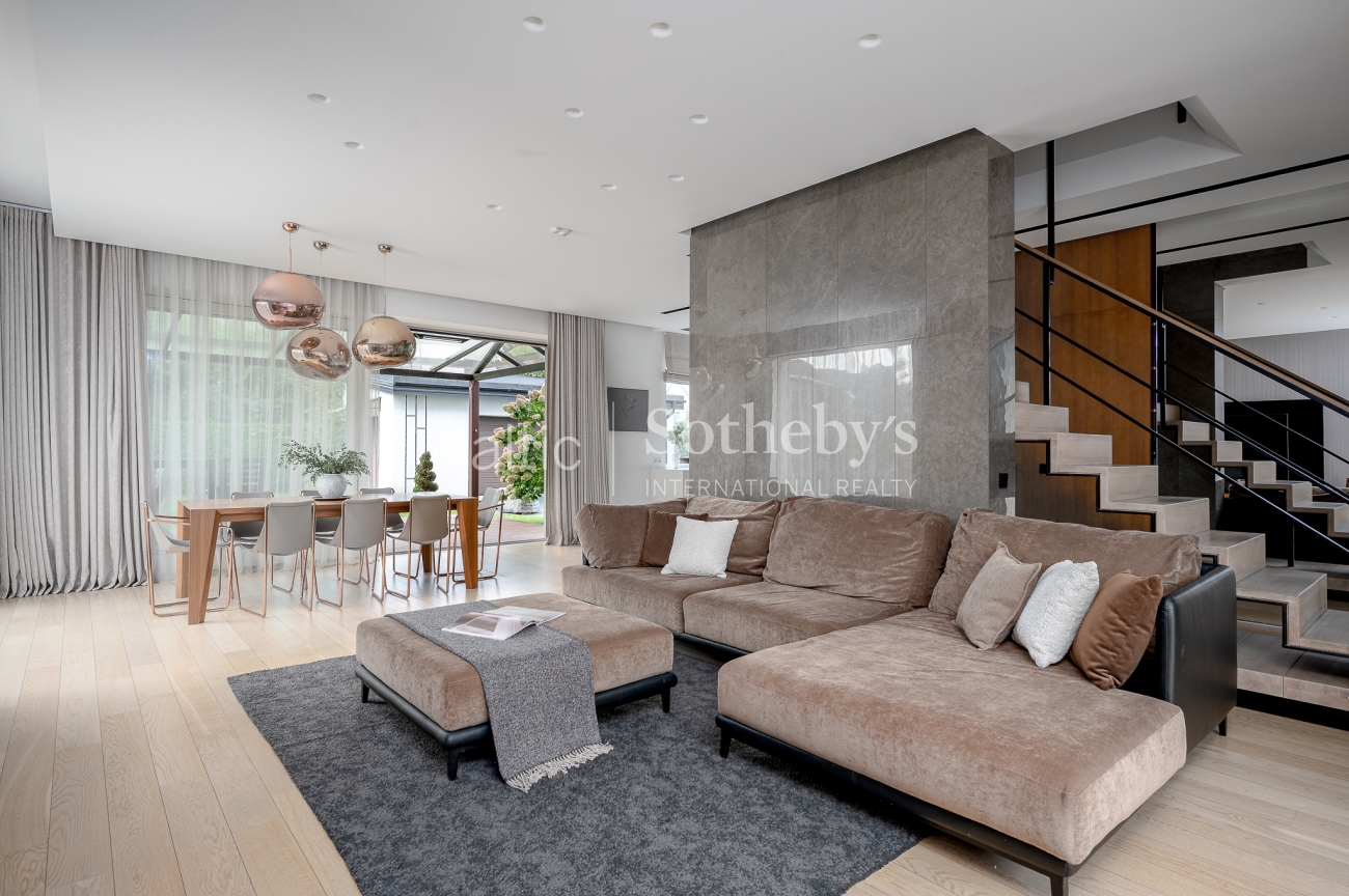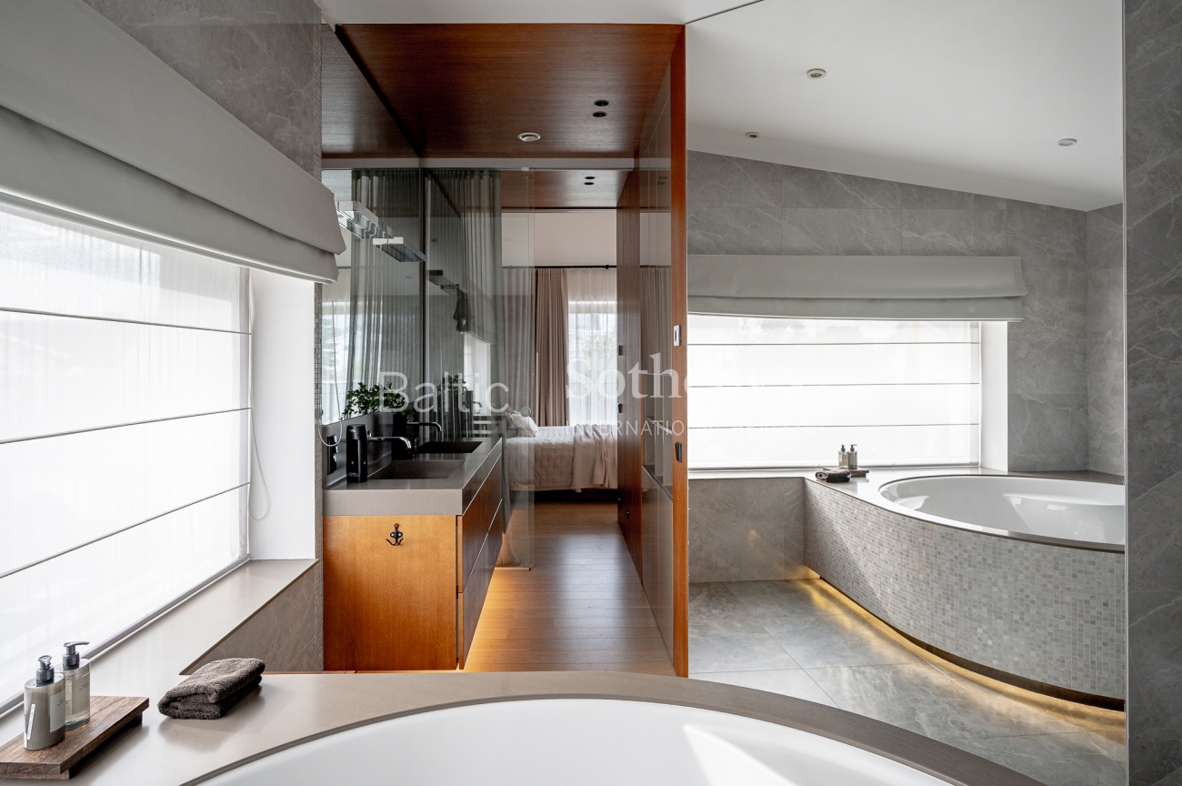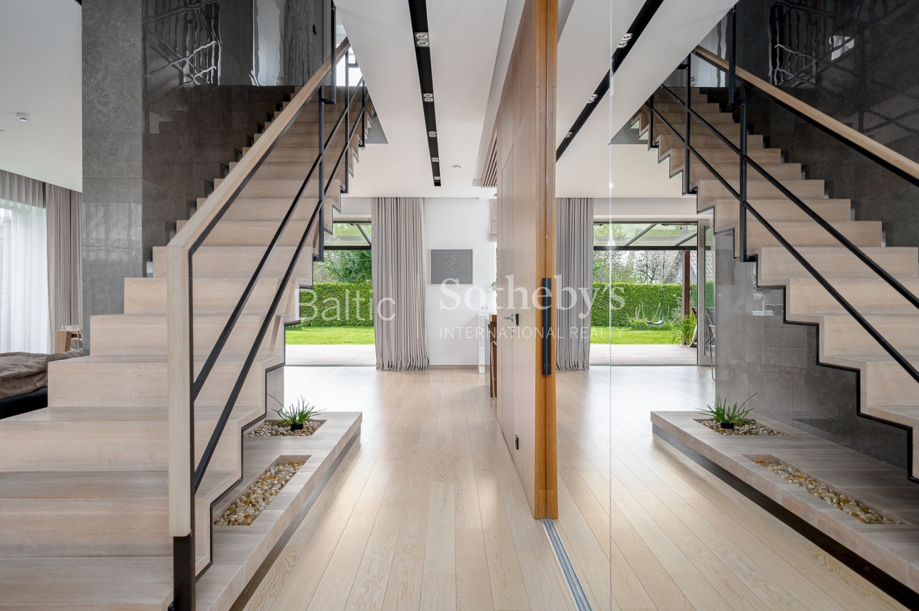 Дом выделяется высококачественными материалами и тщательно продуманной планировкой. Внутри — дубовый паркет, лестницы и двери из массива дерева, каменные столешницы, бытовая техника и инженерные системы премиум-класса. Для максимального комфорта установлены газовое напольное отопление, система кондиционирования воздуха, рекуперации и центральный пылесос.