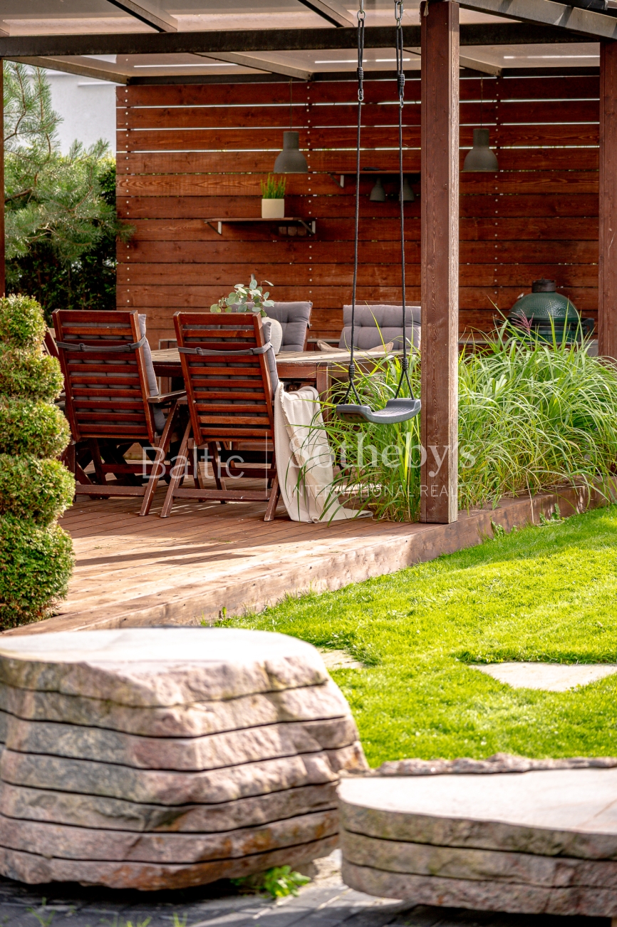 Участок площадью 5,97 сотки, утопающий в зелени, оборудован большой крытой террасой с летней кухней, грилем и обогревателями — для комфортного отдыха на свежем воздухе даже в прохладные вечера. Территория огорожена, благоустроена, установлены автоматические ворота, асфальтированный и освещенный подъезд. Рядом расположен гараж площадью 64 кв. м на два автомобиля.