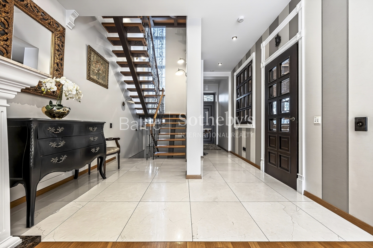 На первом этаже коттеджа находится гостиная с камином, кухня и гостевой санузел. На втором этаже три спальни и ванная комната. На третьем (чердаке) этаже - главная спальня с ванной комнатой и гардеробной. В подвале находится закрытый гараж на два автомобиля.