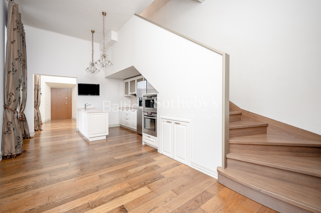 Апартаменты расположились на двух этажах, на первом находится гостиная, кухня, санузел, а на втором – три спальни и два санузла.